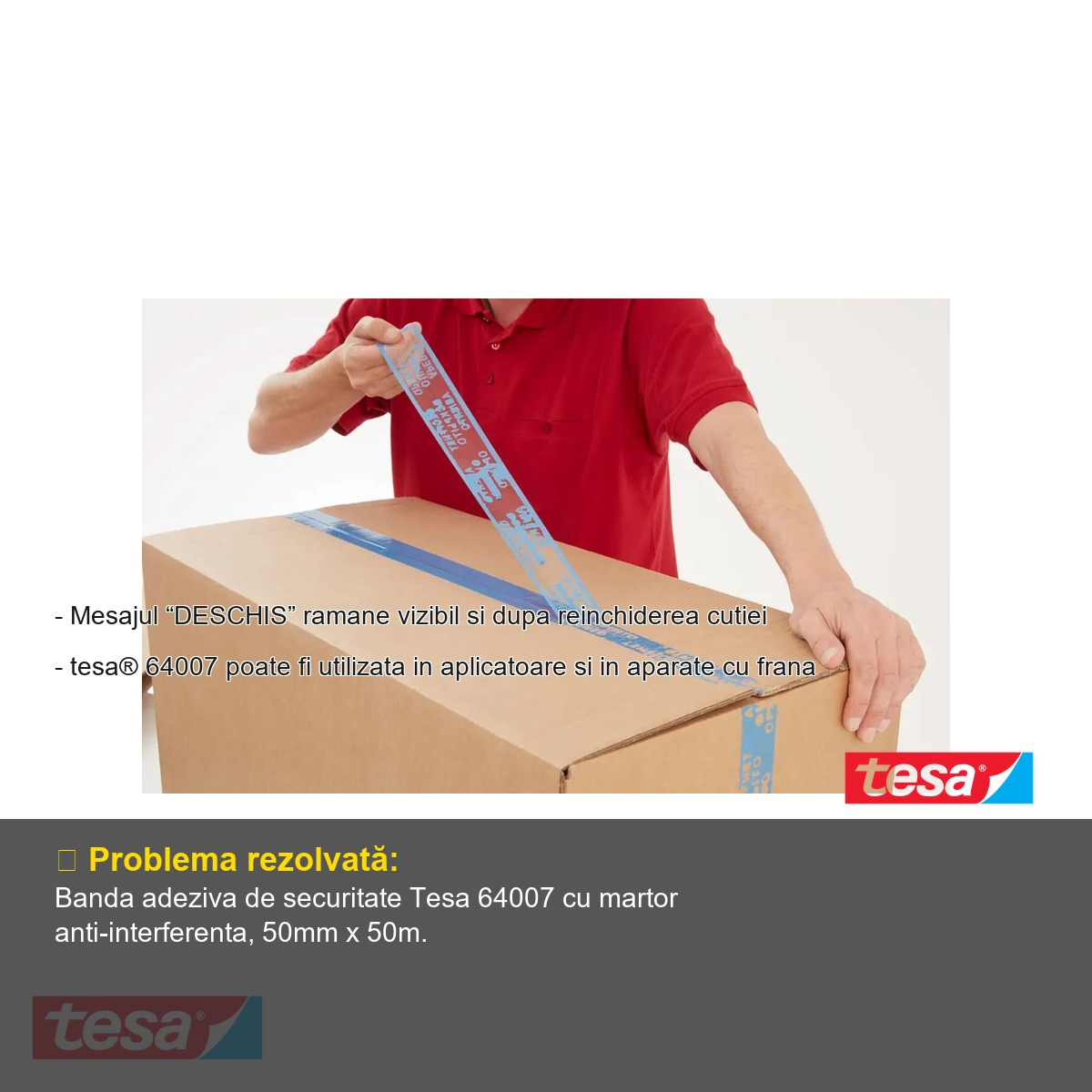 In contextul cresterii volumului de expeditii si al riscurilor asociate transportului de marfuri valoroase, securizarea coletelor a devenit o prioritate pentru companii si expeditori. Banda adeziva antifurt Tesa 64007 a fost conceputa special pentru a preveni deschiderea si reinchiderea neautorizata a cutiilor de carton, oferind un nivel suplimentar de siguranta pentru produsele electronice, hainele de marca, produsele de tutun, actele si orice alt continut confidential sau valoros. Cu ajutorul martorului anti-interferenta integrat, orice tentativa de manipulare a ambalajului devine imediat vizibila, descurajand eficient actele de furt pe parcursul lantului logistic.