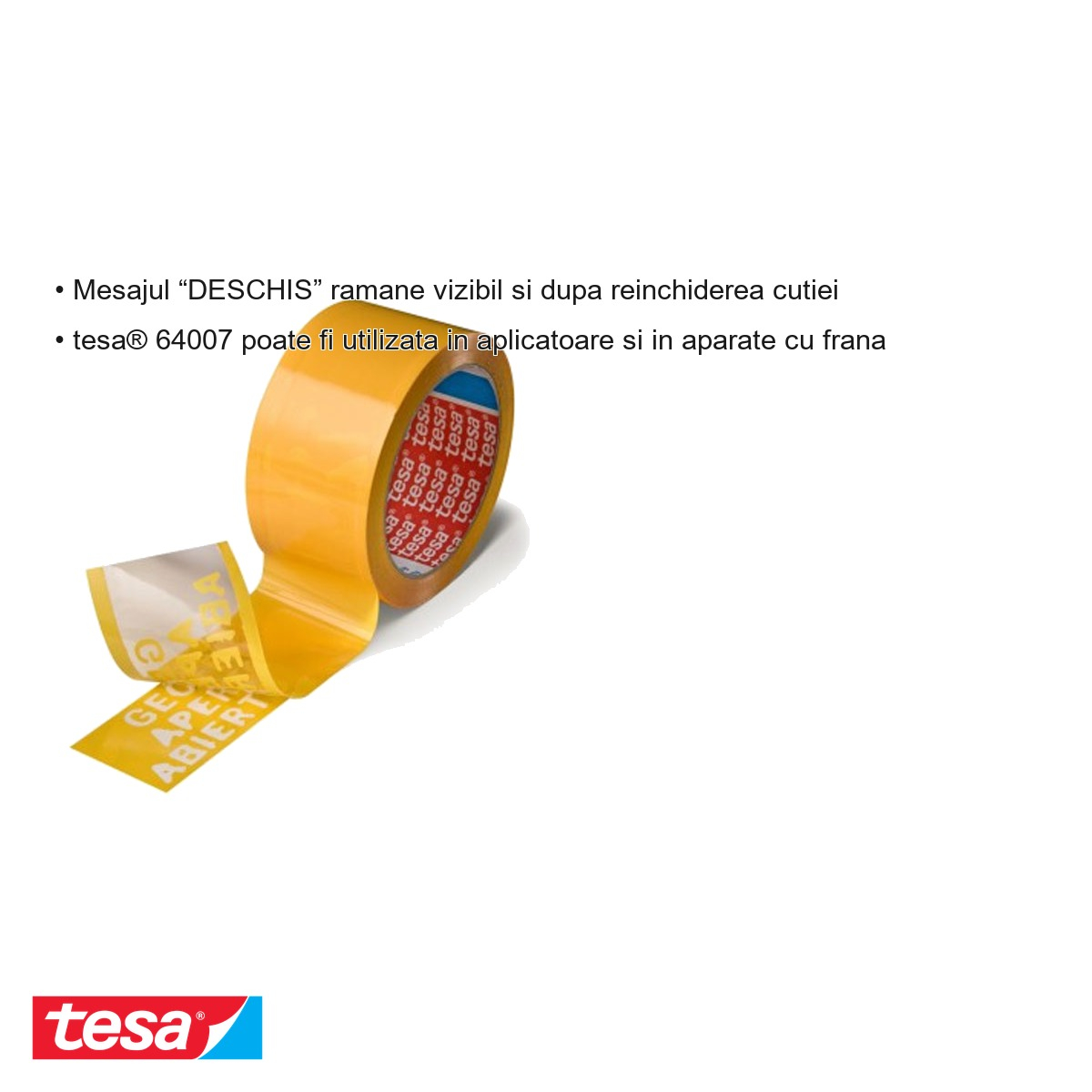 Banda adeziva antifurt Tesa 64007 ofera o serie de avantaje clare fata de benzile adezive obisnuite. In primul rand, martorul anti-interferenta functioneaza in doi pasi distincti: la indepartarea benzii, pe suprafata cutiei ramane imprimat mesajul "DESCHIS" in mai multe limbi, semnal clar si imediat vizibil pentru oricine inspecteaza coletul. Acest mesaj nu dispare nici dupa ce banda este reaplicate, facand tentativa de falsificare imposibil de ascuns. In plus, in unele cazuri, indepartarea benzii duce la ruperea fibrei cartonului, ceea ce face reinchiderea cutiei fizic imposibila. Aceste doua mecanisme combinate asigura o protectie superioara impotriva furtului si manipularii neautorizate. Suportul din polipropilena bi-orientata si adezivul acrilic garanteaza o adeziune puternica si stabila, rezistenta la conditiile intalnite in depozite si in transport. Banda este compatibila cu aplicatoarele manuale si cu aparatele cu frana, ceea ce o face eficienta pentru utilizare in volum mare, reducand timpul de ambalare si costurile operationale.