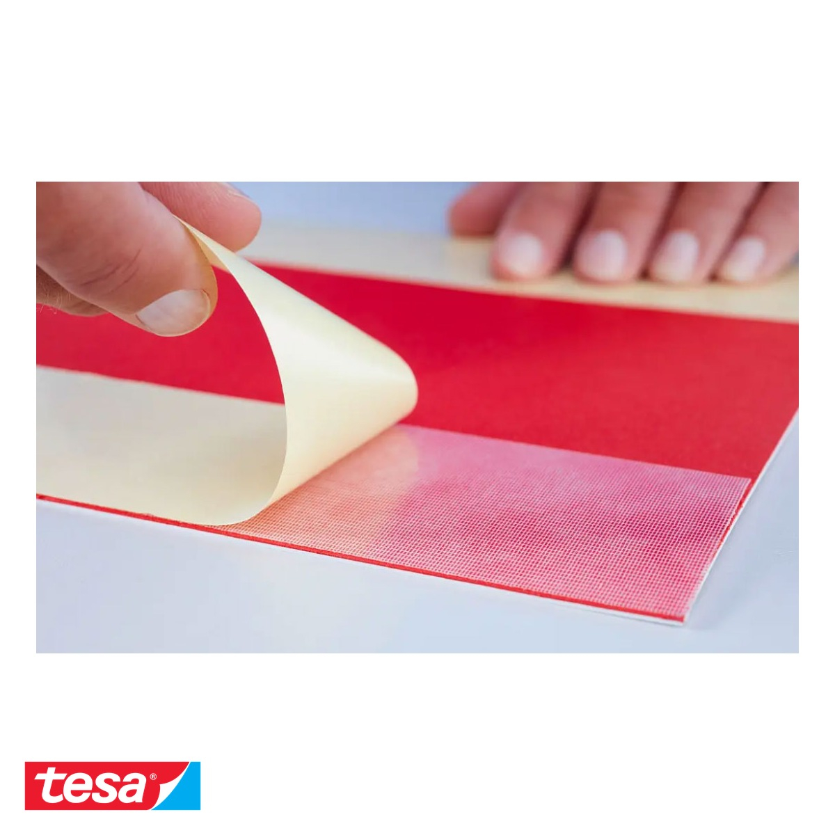 Banda dublu adeziva Tesa 4939 combina doua calitati esentiale care de obicei par incompatibile: fixare puternica si indepartare curata. Sistemul diferential de adeziv din cauciuc face ca una dintre fete sa asigure o prindere robusta pe mocheta, in timp ce cealalta fata - cu formula speciala repozitionabila - adera puternic la suprafata podelei dar se desprinde fara sa lase reziduuri, murdarie sau deteriorari, in conditia respectarii termenului de 14 zile. Suportul din textil/PET confera benzii o rezistenta excelenta la forfecare, ceea ce inseamna ca mocheta nu se va deplasa sau increta in timpul utilizarii, indiferent de traficul pietonal. Un alt avantaj practic important este ca banda poate fi rupta cu mana, fara foarfeca sau cutter, ceea ce accelereaza considerabil procesul de montare, mai ales in conditii de timp redus specifice montajelor pentru evenimente.
