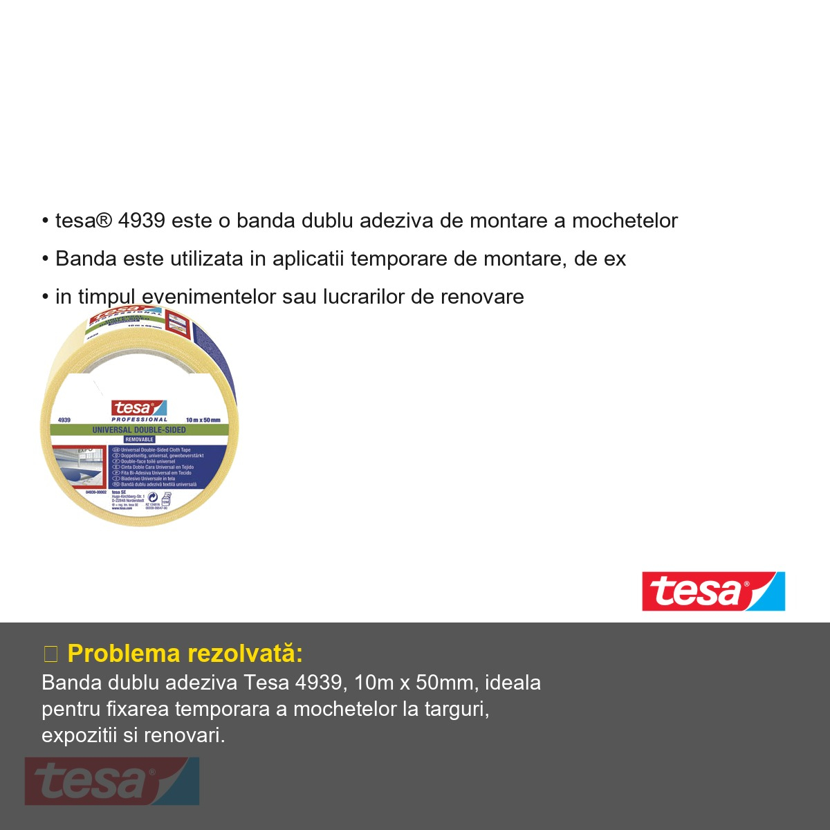 Tesa 4939 a fost conceputa pentru a raspunde cerintelor profesionale din domeniul montajelor temporare. Sistemul sau diferential de adeziv din cauciuc functioneaza pe principiul a doua fete cu proprietati distincte: o fata cu aderenta puternica pe suportul de mocheta si o fata special formulata care permite dezlipirea curata de pe pardoseala sau suprafata de baza, fara a lasa urme sau reziduuri, in limita a 14 zile de la aplicare. Aceasta caracteristica esentiala protejeaza suprafetele valoroase si elimina timpul si costurile asociate cu curatarea dupa demontare.