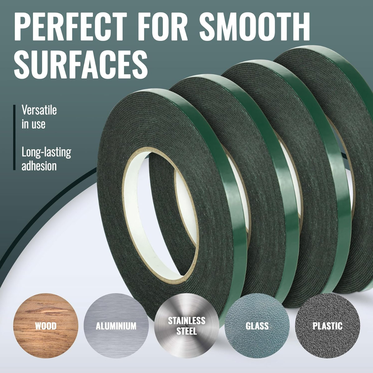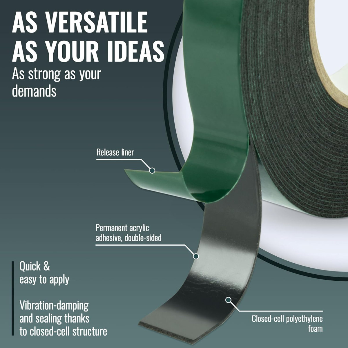 Banda este fabricata dintr-o spuma moale de polietilena (PE) de culoare neagra, acoperita pe ambele parti cu un adeziv acrilic puternic. Folia de protectie este de culoare verde.