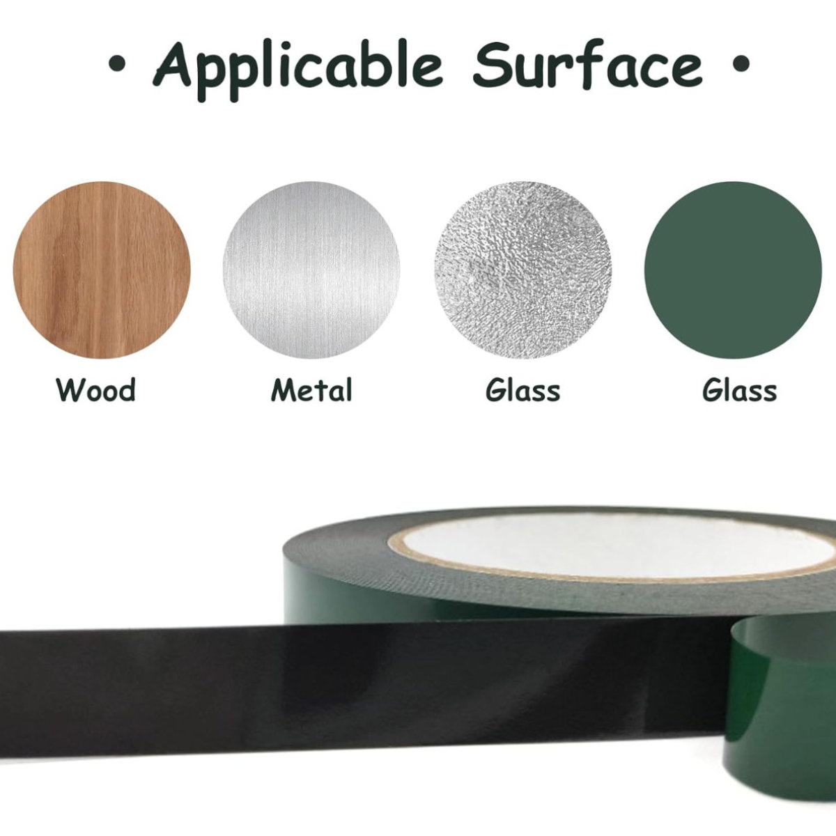 Banda este fabricata dintr-o spuma moale de polietilena (PE) de culoare neagra, acoperita pe ambele parti cu un adeziv acrilic profesional de tip high-bond. Folia de protectie este de culoare verde.