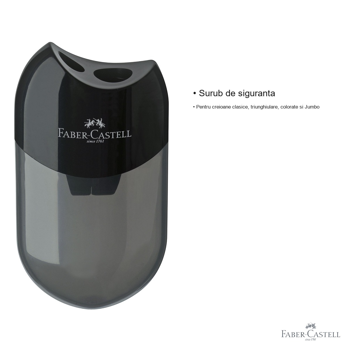Ascutitoarea dubla cu container Faber-Castell ofera o serie de avantaje clare fata de modelele obisnuite de pe piata. In primul rand, containerul integrat pentru reziduuri retine talasul si resturile de la ascutire, eliminand mizeria de pe birou sau din ghiozdan. Nu mai este nevoie de un cos de gunoi la indemana de fiecare data cand ascutesti un creion. In al doilea rand, surubul de siguranta mentine capacul containerului bine fixat, prevenind scurgerea accidentala a continutului. Aceasta caracteristica este extrem de utila mai ales pentru copii, care poarta ascutitoarea in penar sau ghiozdan.