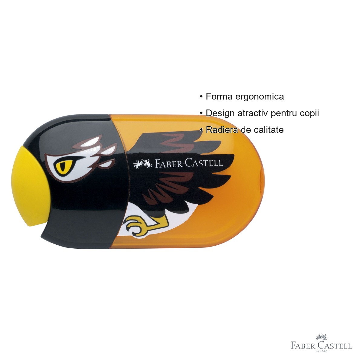 Ascutitoarea dubla Faber-Castell cu container si radiera aduce mai multe avantaje intr-un singur accesoriu compact. In primul rand, containerul integrat retine rumegusul rezultat in urma ascutitului, mentinand curatenia biroului sau a bancii scolare. Nu mai sunt necesare deplasari frecvente la cos, iar riscul de a murdari caietele sau hainele este eliminat. In al doilea rand, radiera inclusa este de calitate, permitand corectarea rapida a greselilor fara a deteriora suprafata hartiei. Forma ergonomica a ascutitorii asigura o prindere comoda si stabila in mana copilului, reducand efortul necesar pentru ascutit. Designul atractiv, specific brandului Faber-Castell, face din acest produs un obiect dorit de cei mici, transformand momentul pregatirii rechizitelor intr-o experienta placuta. Compatibilitatea cu trei tipuri de creioane - clasice, triunghiulare si Jumbo - o face extrem de versatila, acoperind nevoile majoritatii elevilor.