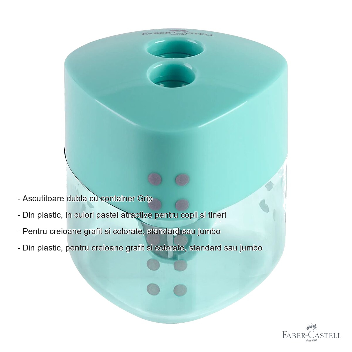 Ascutitoarea dubla Faber-Castell Grip Trend 2019 ofera o serie de avantaje clare fata de ascutitoarele simple de pe piata. In primul rand, datorita celor doua orificii, utilizatorul poate ascuti atat creioane de dimensiune standard, cat si creioane jumbo, fara a fi nevoie de doua accesorii separate. Acest lucru o face extrem de versatila si economica. Containerul integrat pentru colectarea talasului reprezinta un alt avantaj major: talasul nu cade pe masa sau pe caiet, mentinand zona de lucru curata si ordonata. Copiii invata astfel si un comportament responsabil legat de curatenie. Culorile pastel atractive din gama Trend 2019 fac din aceasta ascutitoare un obiect care atrage atentia in mod placut, motivand copiii si tinerii sa isi ingrijeasca ustensilele de scris. Calitatea Faber-Castell garanteaza o lama ascutita si durabila, care asigura un varf uniform si precis la fiecare ascutire, fara a rupe mina creioanelor.