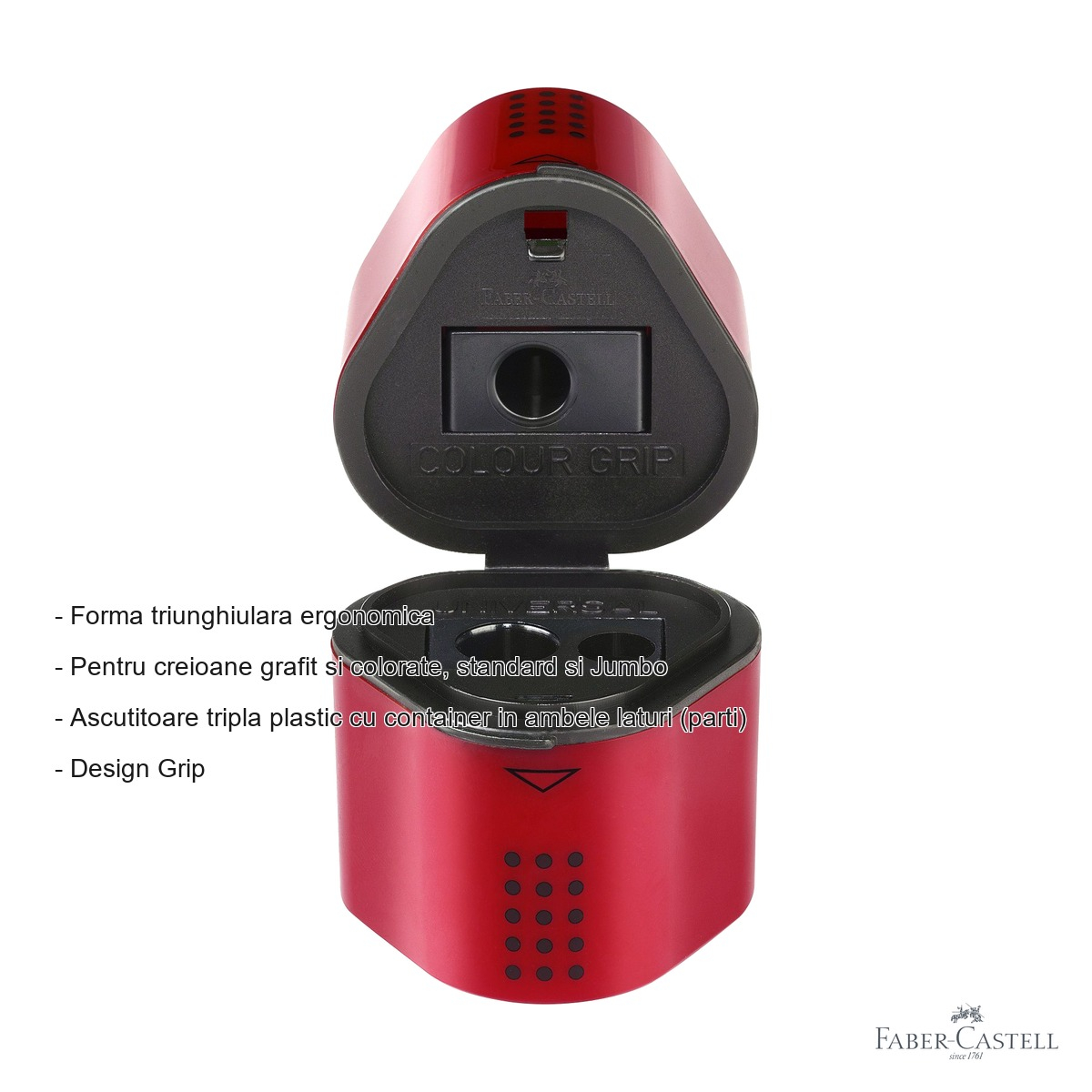 Indiferent ca esti elev, student, artist sau pasionat de desen, un instrument de ascutit de calitate face diferenta intre un varf perfect si unul franjurat. Ascutitoarea tripla Faber-Castell Grip 2001 a fost conceputa pentru a raspunde nevoilor diverse ale utilizatorilor care lucreaza cu mai multe tipuri de creioane. Cu un design ergonomic triunghiular, aceasta ascutitoare se potriveste natural in mana, reducand efortul si oferind un control precis in timpul ascutitului. Containerul integrat pe ambele parti asigura colectarea comoda a reziduurilor, pastrand masa de lucru curata si ordonata.