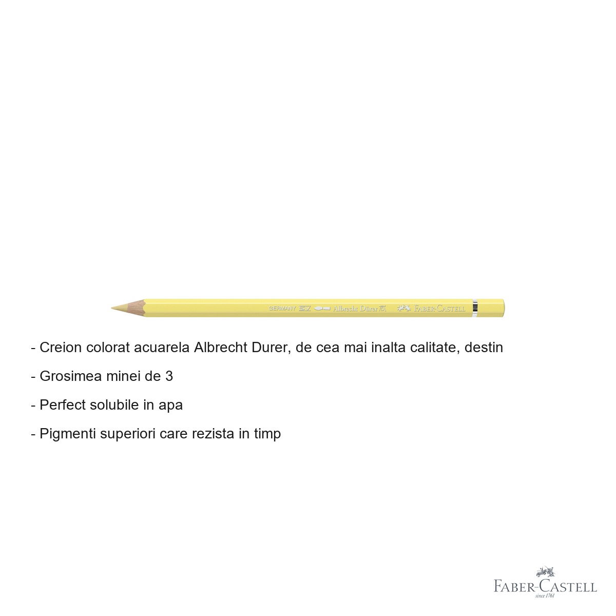 Pentru artistii care doresc sa combine precizia desenului cu expresivitatea picturii in acuarela, creioanele colorate Albrecht Durer reprezinta alegerea ideala. Acest creion colorat acuarela in nuanta crem 102 ofera versatilitate maxima in exprimarea artistica, permitand trecerea usoara de la tehnica uscata la efecte de acuarela prin simpla adaugare a apei.