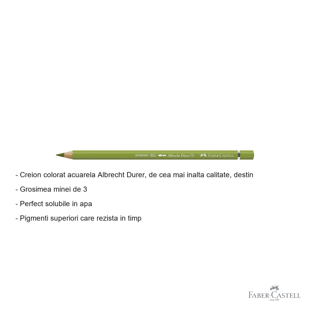 Pentru artistii care cauta excelenta in exprimarea artistica prin tehnica acuarelei, creionul colorat Albrecht Durer reprezinta instrumentul ideal. Acest creion profesional combina precizia desenului in creion cu fluiditatea picturii in acuarela, oferind posibilitati creative nelimitate. Nuanta verde galbui-pamant 168 este perfecta pentru peisaje naturale, studii botanice si compozitii artistice complexe.
