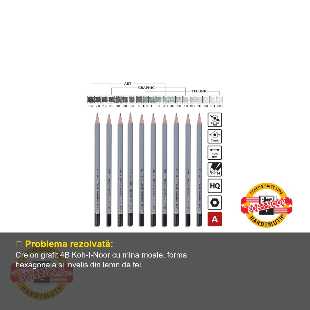 Koh-I-Noor este unul dintre cele mai respectate branduri din industria instrumentelor de scris si desen, cu o traditie indelungata in productia de creioane de calitate superioara. Creionul grafit 4B face parte dintr-o gama de 20 de gradatii diferite, asigurand o paleta completa pentru orice tehnica grafica.