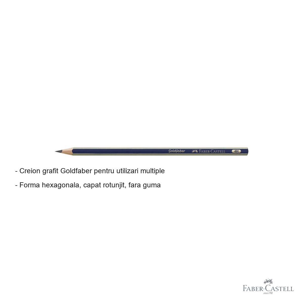 Creionul grafit Goldfaber 1221 de la Faber-Castell este unul dintre cele mai cunoscute si apreciate instrumente de scris din lume, datorita calitatii constante a minei si a corpului bine echilibrat. Duritatea 4H asigura o mina ferma, care nu se rupe usor si care permite trasarea unor linii extrem de fine, cu un nivel ridicat de precizie. Forma hexagonala a corpului ofera o priza sigura si confortabila in mana, reducand oboseala in timpul utilizarii prelungite. Capatul rotunjit protejeaza creionul in timpul transportului si al depozitarii. Faptul ca nu are guma incorporata il face mai usor si mai simplu ca design, permitand utilizatorului sa aleaga radiera potrivita pentru necesitatile sale specifice. Gama Goldfaber este sinonima cu fiabilitatea si longevitatea, iar reputatia brandului Faber-Castell vorbeste de la sine in ceea ce priveste standardele de fabricatie.