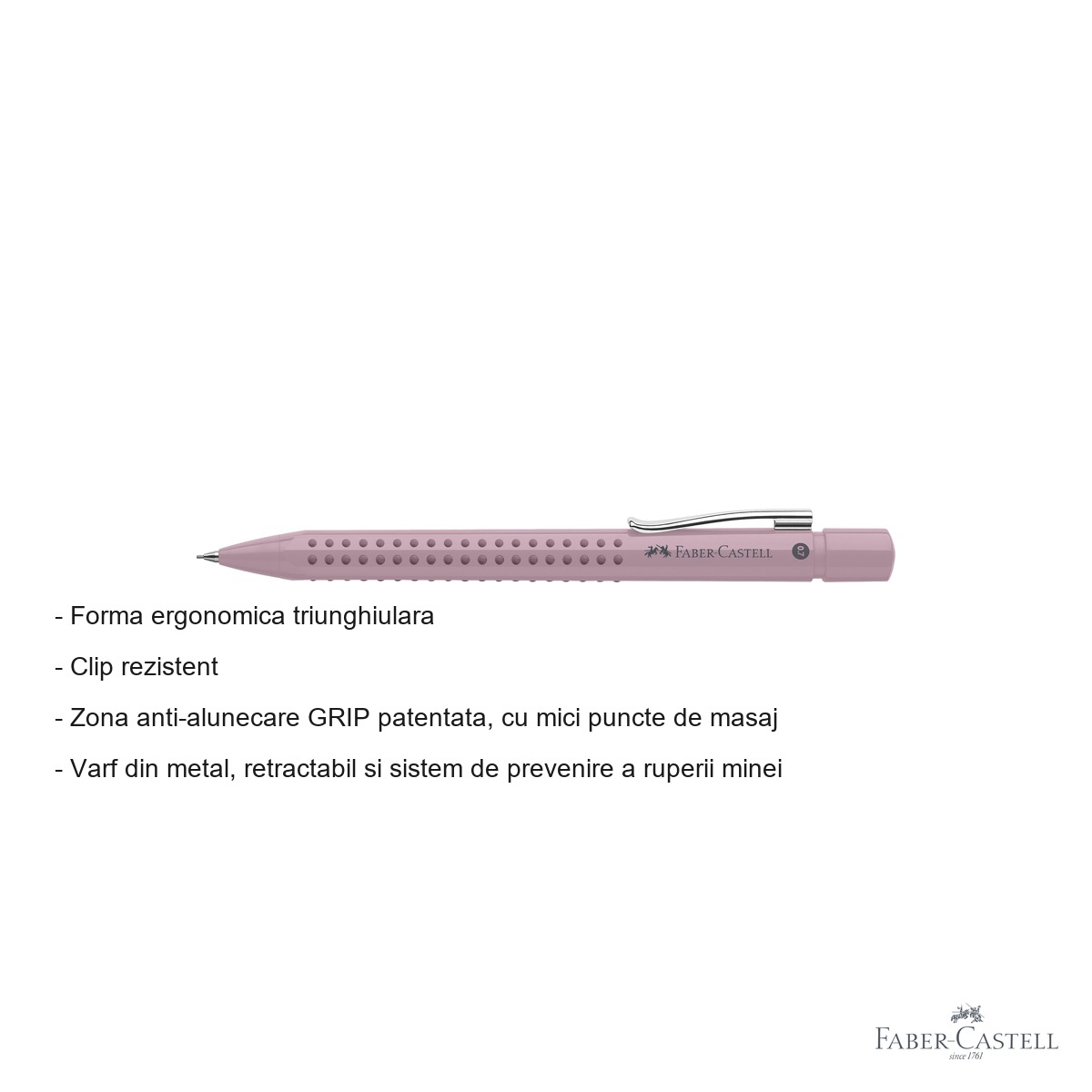 Recomandari de utilizare: Pentru rezultate optime, recomandam utilizarea minelor originale Faber-Castell 0.7mm care se potrivesc perfect cu mecanismul creionului. Varful retractabil trebuie intotdeauna retras dupa utilizare pentru a preveni deteriorarea si pentru a mentine precizia scrierii. Zona Grip se curata usor cu o carpa umeda pentru a mentine aderenta optima. Acest creion mecanic este ideal pentru cei care apreciaza instrumentele de scris de calitate si doresc sa imbine functionalitatea cu design-ul modern.