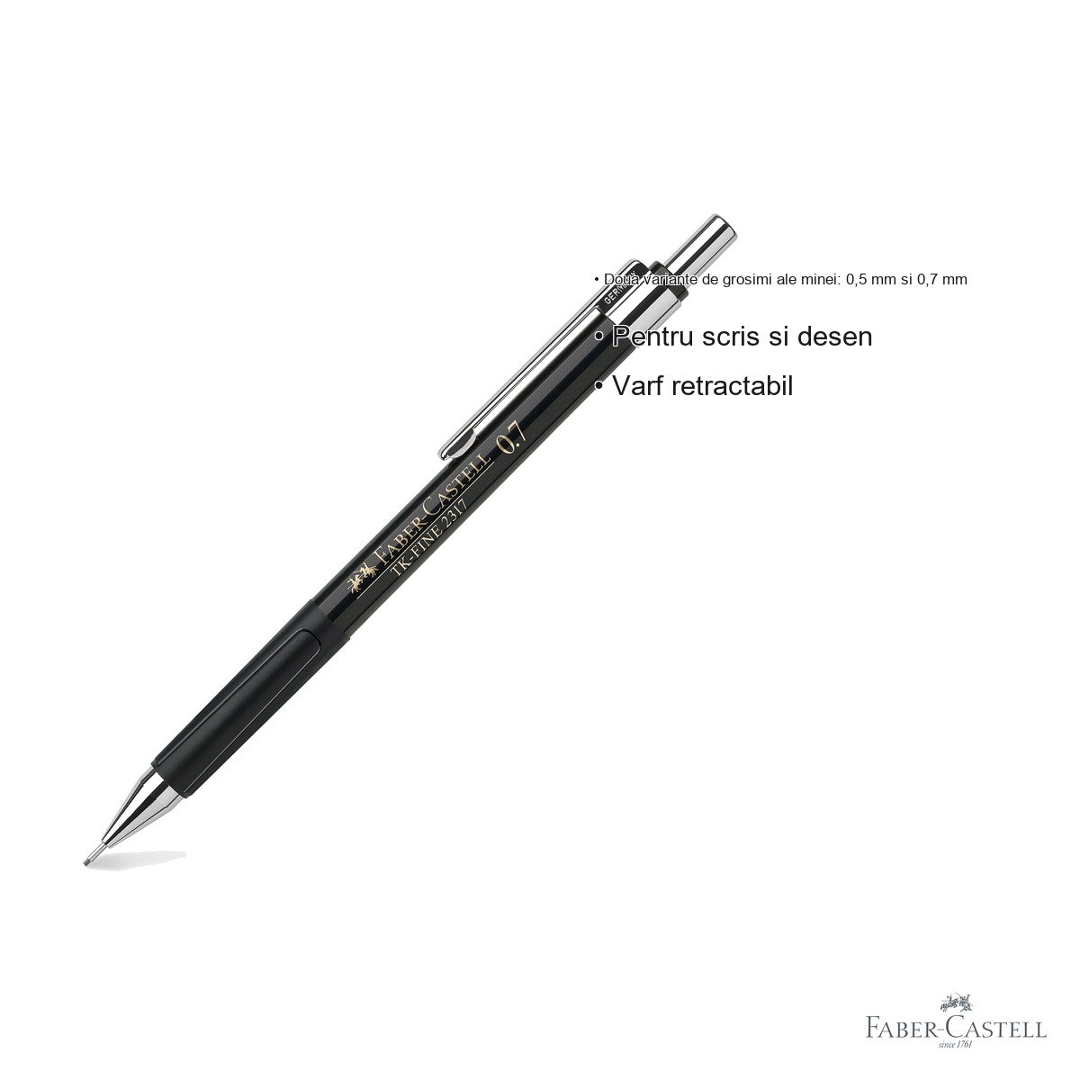 Recomandari de utilizare: Pentru rezultate optime, recomandam utilizarea minelor de calitate Faber-Castell de 0.7mm. Mecanismul de avansare a minei trebuie actionat cu grija pentru a evita blocarea. Depozitati creionul cu varful retractat pentru a prelungi durata de viata a produsului. Este ideal pentru persoanele care alterneaza frecvent intre scris si desen, oferind versatilitate maxima intr-un singur instrument.