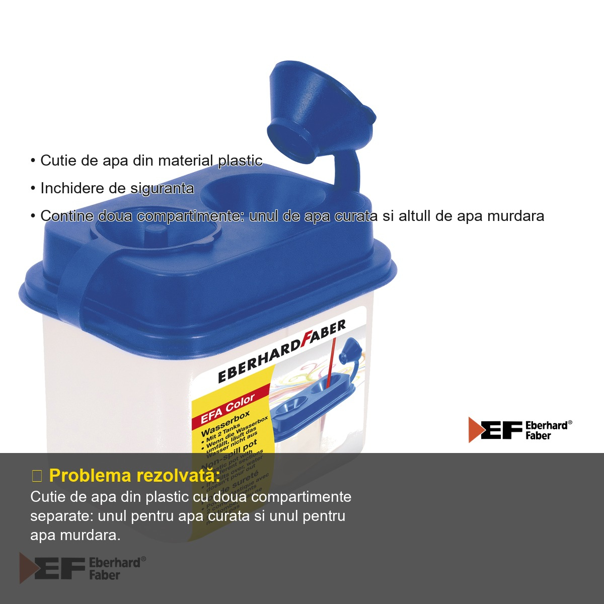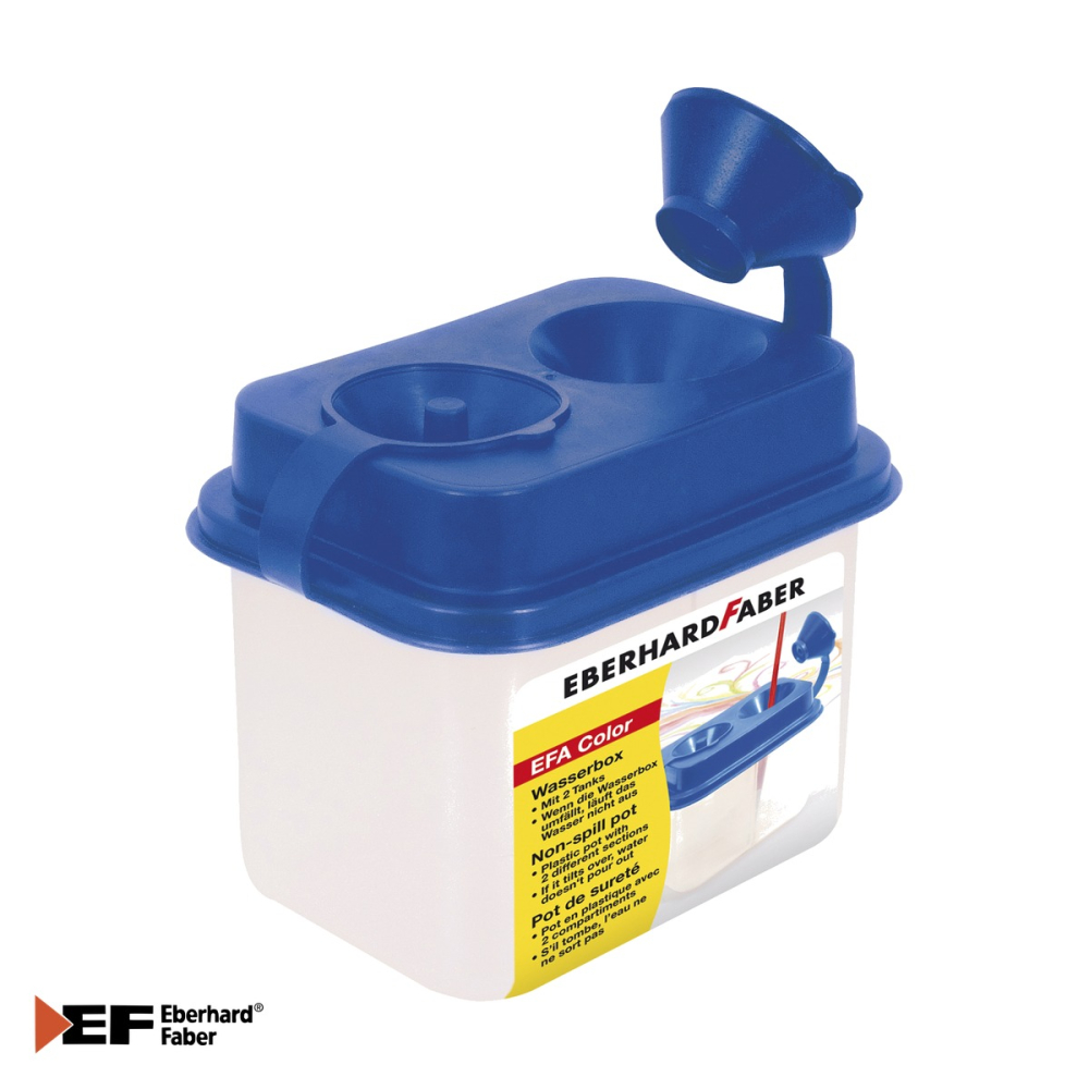Orice activitate de pictura, fie ca se desfasoara in sala de clasa, in atelier sau acasa, necesita un recipient practic si sigur pentru apa. Cutia dubla de apa Eberhard Faber este solutia ideala pentru toti cei care doresc sa isi organizeze eficient spatiul de lucru atunci cand folosesc acuarele, tempera sau alte culori pe baza de apa. Datorita designului sau inteligent cu doua compartimente distincte, aceasta cutie permite separarea apei curate de apa murdara, asigurand culori mai precise si un proces de lucru mai curat si mai ordonat.
