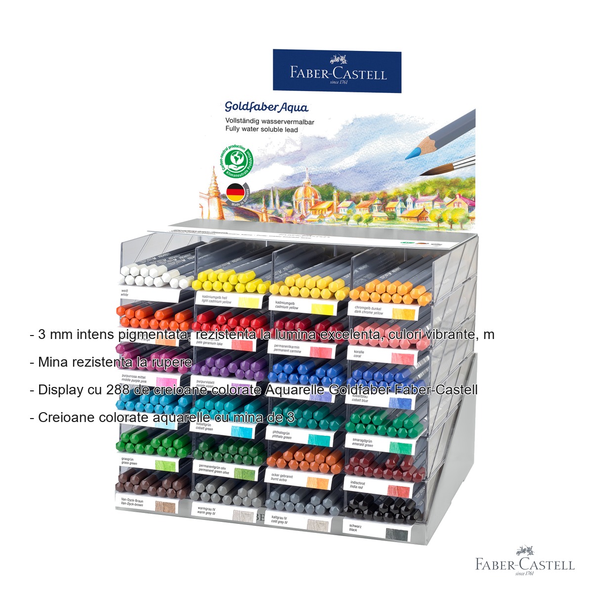 Pentru atelierele de arta, magazinele de specialitate sau artistii profesionisti care lucreaza cu volume mari, acest display cu 288 de creioane colorate acuarela Goldfaber reprezinta solutia ideala. Faber-Castell, cu o traditie de peste 260 de ani in productia de instrumente de scris si desen, ofera prin gama Goldfaber o calitate superioara la un pret accesibil, facand arta acuarelei disponibila atat pentru incepatori cat si pentru profesionisti.