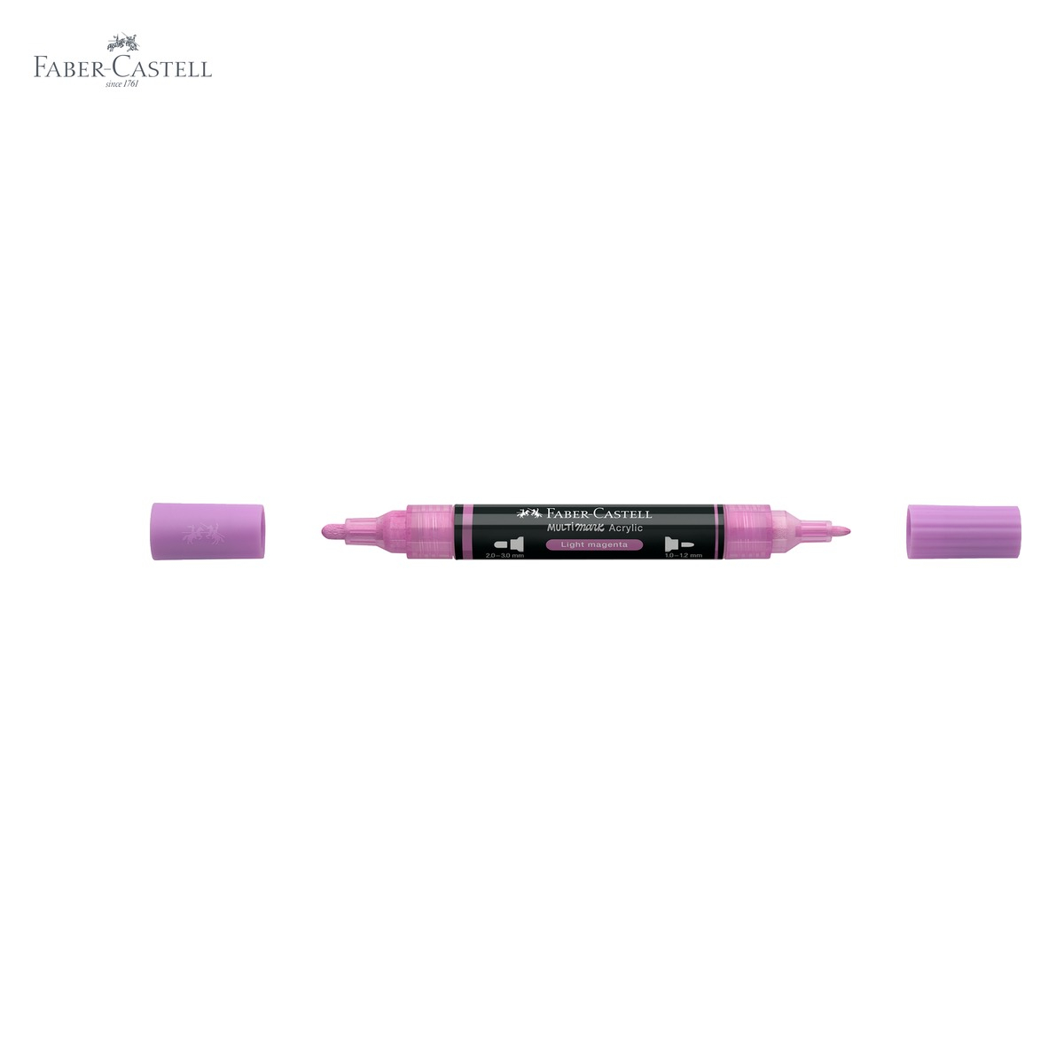 Markerul acrilic Multimark Faber-Castell vine cu o serie de avantaje care il diferentiaza de produsele similare de pe piata. In primul rand, cerneala pe baza de apa este mai prietenoasa cu mediul si mai usor de indepartat de pe maini sau suprafete nedorite atunci cand este inca umeda. Opacitatea ridicata a cernelii garanteaza o acoperire excelenta chiar si pe suprafete inchise la culoare, fara a fi nevoie de mai multe straturi. Varful dublu reprezinta un avantaj major: poti trece cu usurinta de la acoperire larga la detalii fine fara sa schimbi instrumentul. Indicatorul de nivel al cernelii iti permite sa stii exact cand este momentul sa inlocuiesti markerul, fara surprize neplacute in mijlocul unui proiect. Culoarea magenta deschis (119) este o nuanta vibranta, versatila, care se potriveste in palete calde, compozitii florale sau proiecte pop art.