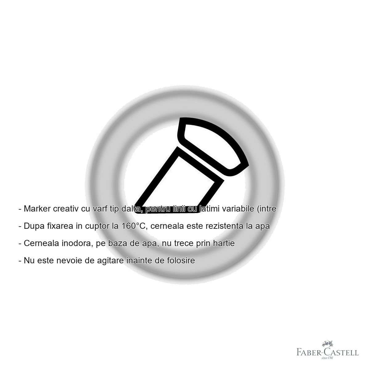Markerul Faber-Castell Goldfaber 501 alb se remarca prin mai multe avantaje care il diferentiaza in categoria markerelor creative. In primul rand, cerneala pe baza de apa este inodora, ceea ce inseamna ca poate fi folosit fara disconfort in spatii inchise, in salile de clasa sau in atelierele de creatie fara ventilatie speciala. Spre deosebire de multi alti markere permanente, cerneala sa nu strapunge hartia, pastrand curatenia lucrarii si permitand utilizarea ambelor fete ale foii. Varful tip dalta este un avantaj major pentru cei care doresc versatilitate: cu o simpla rotatie a markerului, poti alege intre o linie fina de 1 mm sau o banda lata de pana la 5 mm, perfect pentru umplerea rapida a suprafetelor sau pentru scrierea caligrafica. Un alt beneficiu important este faptul ca, dupa fixarea termica in cuptor la 160°C, cerneala devine rezistenta la apa, ceea ce extinde considerabil durata de viata a lucrarilor si le face potrivite pentru obiecte care vor fi spalate sau expuse la umiditate. In plus, nu este necesara agitarea markerului inainte de folosire, ceea ce simplifica procesul de lucru si evita eventualele accidente.