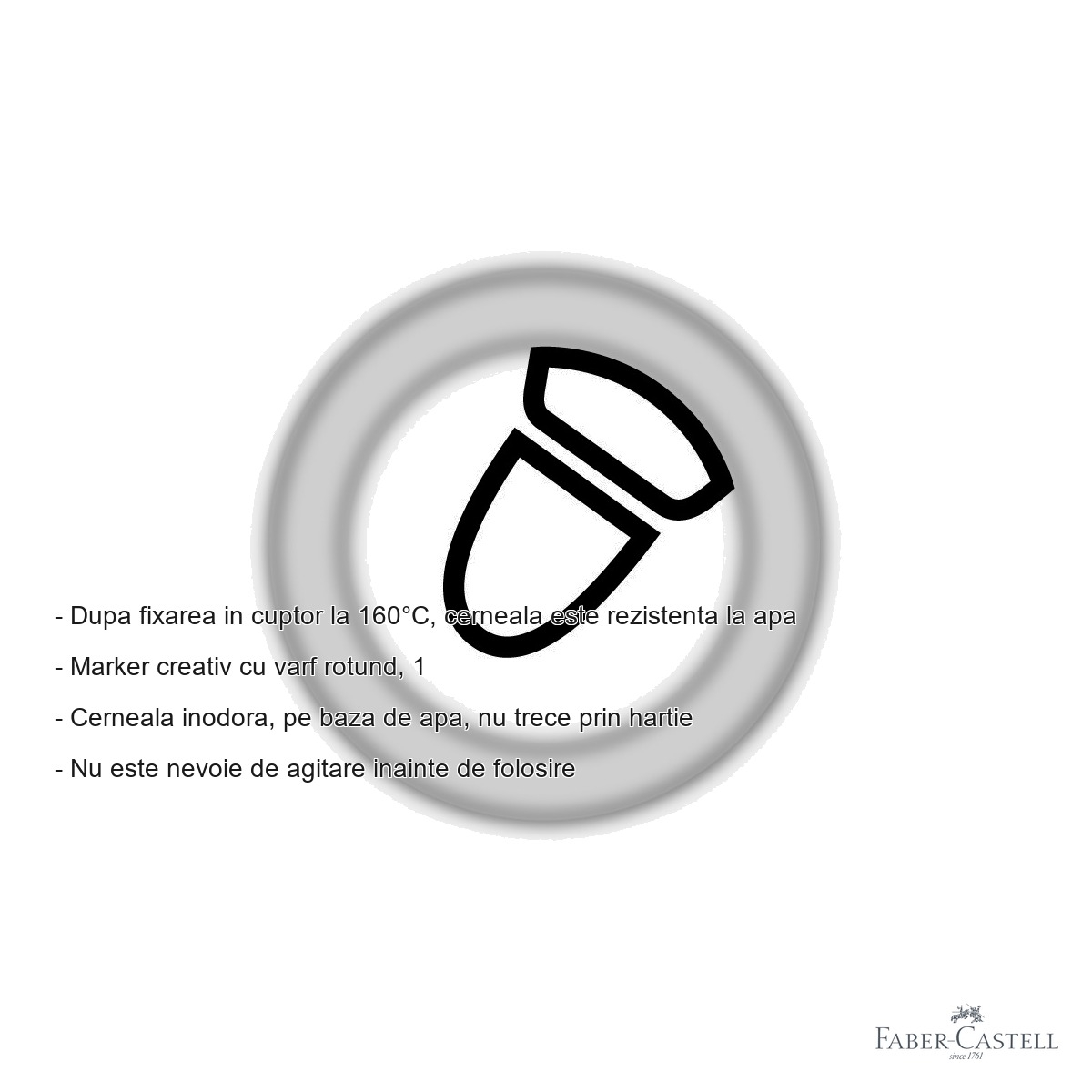 Marker-ul creativ Goldfaber alb 501 Faber-Castell se remarca printr-o serie de avantaje care il plaseaza intr-o categorie superioara fata de markerele obisnuite. Cerneala pe baza de apa este prietenoasa cu mediul inconjurator si sigura pentru utilizare in spatii inchise datorita lipsei mirosului. Un aspect important este faptul ca cerneala nu trece prin hartie, ceea ce inseamna ca poti lucra fara grija ca vei patrunde prin foaie sau ca vei murdari suprafata de dedesubt. Versatilitatea este un alt punct forte: poti folosi acest marker pe hartie, carton, sticla, plastic, metal si piatra, ceea ce il transforma intr-un instrument unic in trusa oricarui creativ. Dupa ce ai aplicat cerneala pe suprafete suportabile termic, fixarea in cuptor la 160 de grade Celsius o transforma intr-un strat rezistent la apa, ideal pentru obiecte decorative de lunga durata. In plus, nu este necesara agitarea inainte de folosire, ceea ce simplifica procesul de lucru si reduce timpul de pregatire.