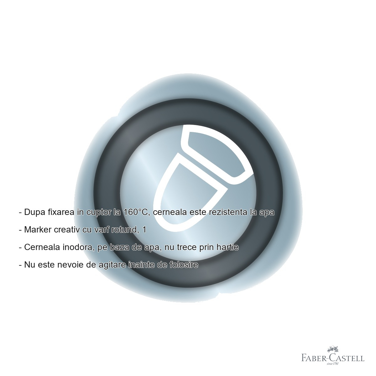 Marker-ul Faber-Castell Goldfaber Bleu Ice Metalizat aduce cu sine o serie de avantaje clare fata de markere obisnuite. In primul rand, cerneala pe baza de apa este complet inodora, ceea ce il face potrivit pentru utilizare in spatii inchise, alaturi de copii sau in birouri. Spre deosebire de markere cu solventi, acesta nu emite vapori nocivi si nu irita caile respiratorii. In al doilea rand, cerneala nu trece prin hartie, eliminand riscul de a pata suprafetele de sub foaie - un avantaj important atunci cand lucrezi in blocuri de desen sau caiete. Efectul metalizat al nuantei bleu ice adauga un plus de distinctie oricarui proiect, conferind un aspect premium si sofisticat. Un alt beneficiu major este rezistenta la apa dupa fixare in cuptor la 160°C, ceea ce face ca obiectele decorate pe sticla, ceramica sau metal sa devina durabile si rezistente in timp. Nu in ultimul rand, nu este necesara agitarea markerului inainte de folosire, ceea ce simplifica procesul de lucru si reduce riscul de scurgeri accidentale.