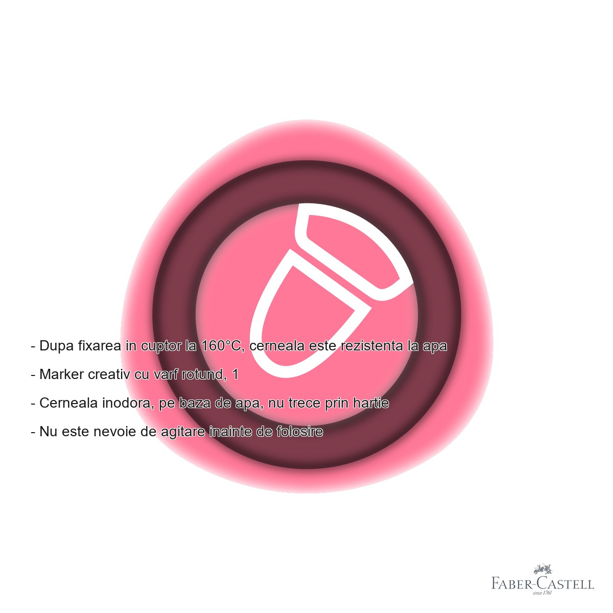 Markerul creativ Faber-Castell Goldfaber Roz Candy 528 vine cu o serie de avantaje care il fac sa se remarce printre instrumentele creative disponibile pe piata. In primul rand, cerneala pe baza de apa este complet inodora, ceea ce il face potrivit pentru utilizare in spatii inchise, alaturi de copii sau in birouri, fara riscul inhalarii de substante nocive. In al doilea rand, cerneala nu penetreaza hartia, astfel incat nu vei mai intampina probleme cu patarea paginilor de dedesubt, pastrandu-ti lucrarile curate si ingrijite. Un alt avantaj major este posibilitatea de a fixa cerneala in cuptor la 160°C, dupa care aceasta devine rezistenta la apa - un beneficiu esential atunci cand decorezi obiecte care vor fi folosite sau spalate ulterior, cum ar fi paharele sau obiectele din plastic. In plus, markerul nu necesita agitare inainte de utilizare, ceea ce simplifica procesul de lucru si economiseste timp. Varful rotund de 1.5mm ofera un control excelent al trasaturii, permitand atat detalii fine, cat si linii mai groase in functie de unghiul de aplicare. Nuanta roz candy 528 este o culoare vibranta, cu personalitate, perfecta pentru proiecte creative, decoratiuni festive sau lucrari artistice care cer un plus de expresivitate.