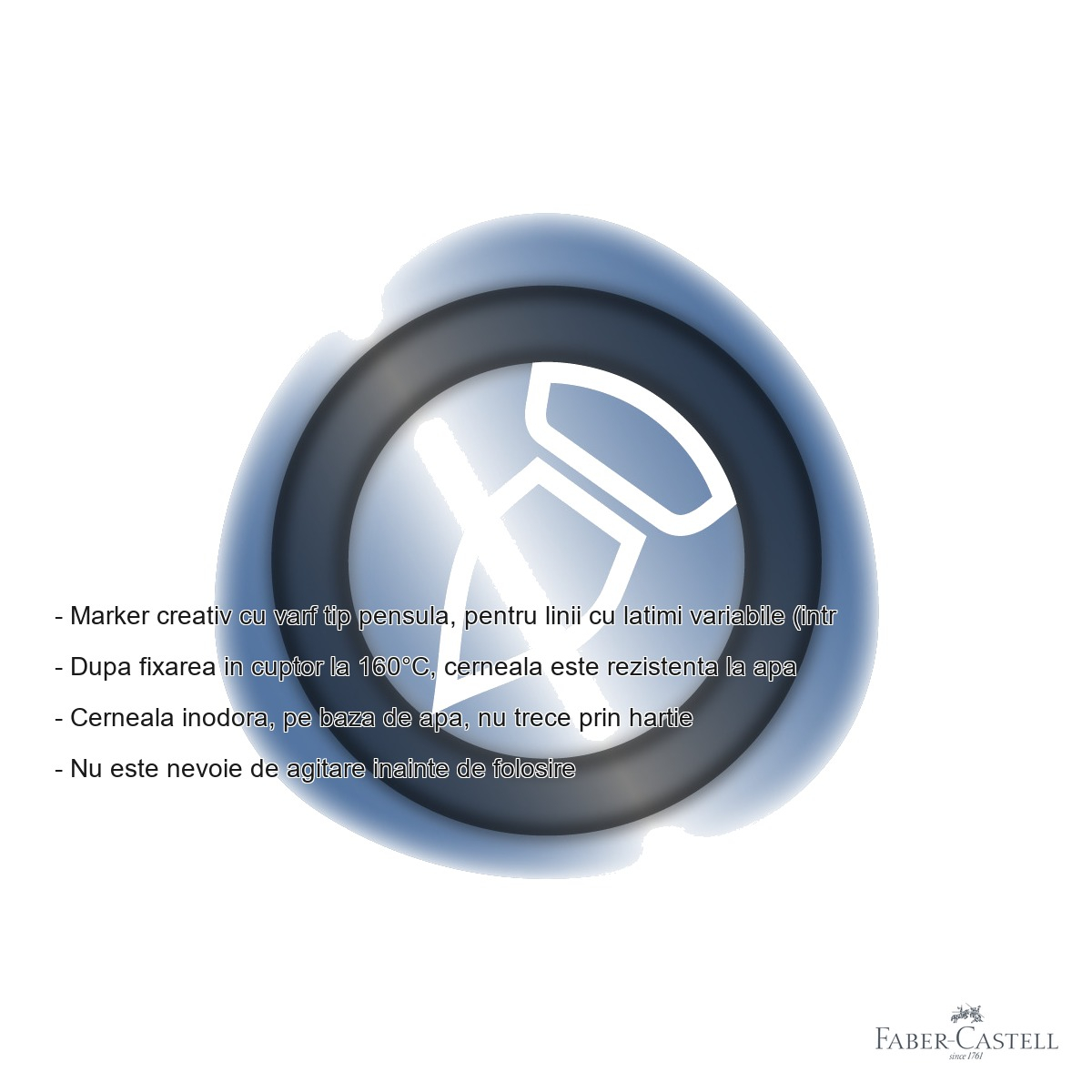 Formulata pe baza de apa, cerneala este inodora si nu trece prin hartie, ceea ce o face sigura si comoda de utilizat in spatii inchise, inclusiv de catre persoane sensibile la mirosurile puternice. Un alt beneficiu notabil este faptul ca nu este necesara agitarea markerului inainte de utilizare, astfel incat poti incepe sa lucrezi imediat, fara pasi suplimentari de pregatire. Dupa fixarea in cuptor la 160 de grade Celsius, cerneala devine rezistenta la apa, ceea ce extinde semnificativ durata de viata a lucrarilor realizate pe suprafete speciale, cum ar fi sticla sau ceramica.