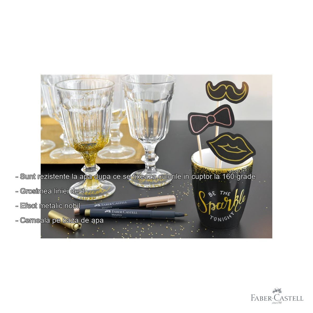 Markerul Metalic Cupru Faber-Castell este conceput pentru utilizatori care nu vor sa faca compromisuri in ceea ce priveste calitatea. Cerneala pe baza de apa este prietenoasa cu utilizatorul si nu emite vapori sau mirosuri neplacute, ceea ce il face ideal pentru utilizare in spatii inchise, inclusiv in ateliere sau la birou. Efectul metalic este vizibil imediat dupa aplicare, fara a necesita tehnici speciale sau produse suplimentare. Un alt avantaj important este faptul ca nu este nevoie sa agiti markerul inainte de utilizare, economisind timp si evitand accidentele. Culoarea nu se transfera prin hartie, ceea ce inseamna ca poti lucra pe ambele fete ale unei coli fara grija petelor. Dupa fixare in cuptor la 160 de grade Celsius, rezistenta la apa face ca lucrarile realizate pe portelan, sticla sau metal sa fie durabile si potrivite chiar si pentru obiecte care vor fi spalate. Faber-Castell este un brand cu traditie si renume mondial in industria instrumentelor de scris si a materialelor de arta, garantand o calitate constanta a produselor sale.