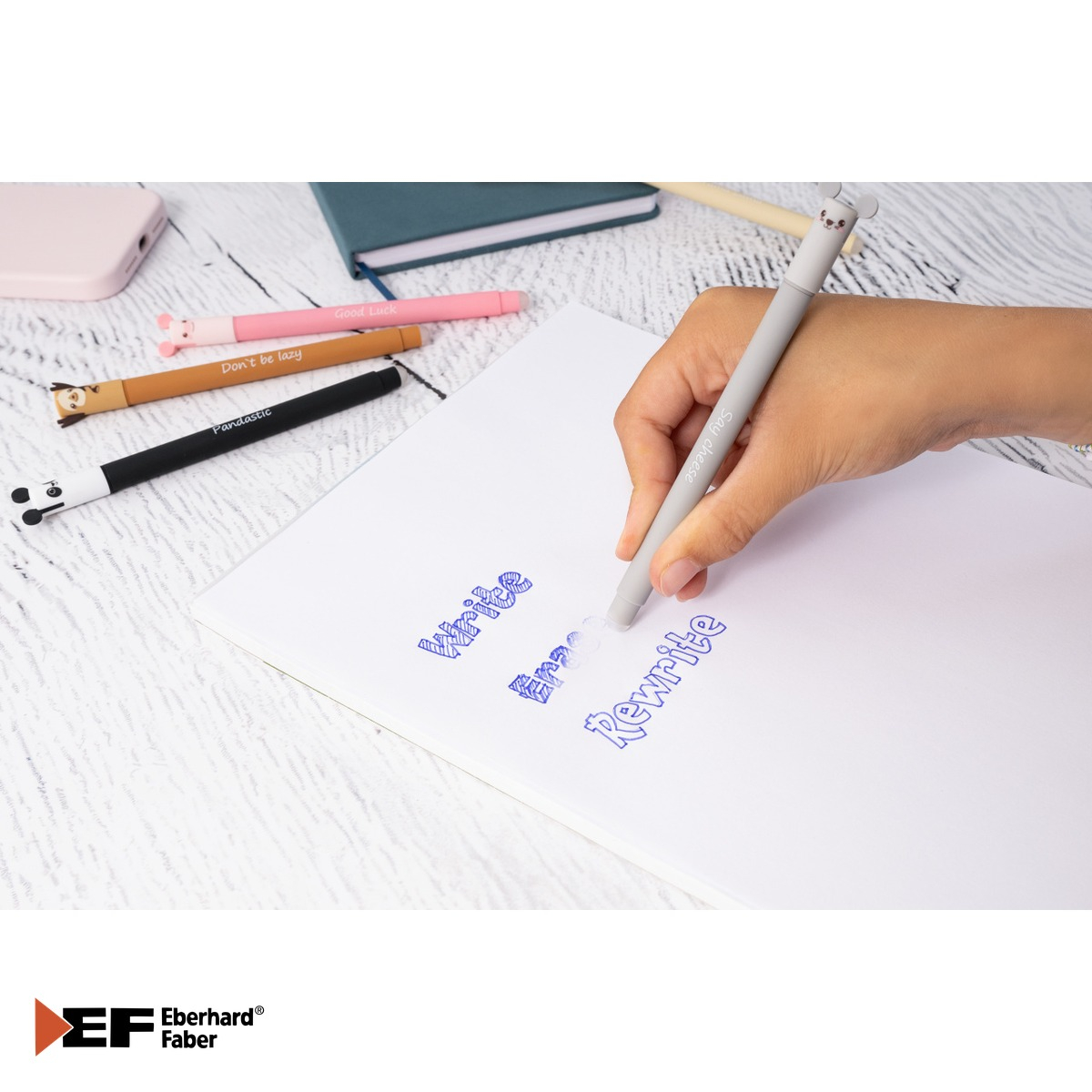 Principalul avantaj al acestui roller este cerneala termosensibila care permite stergerea completa a textului prin simpla frecare cu capatul special al rollerului, fara a lasa urme inestetice pe hartie. Nu mai este nevoie de radiera separata sau de fluid corector - totul este integrat intr-un singur instrument. Linia de 0.7 mm ofera un scris fluid, clar si bine definit, potrivit atat pentru litere de tipar cat si pentru scriere cursiva. Designul haios cu motiv purcelus face acest roller atractiv in special pentru copii si tineri, transformand scrisul intr-o activitate placuta. Calitatea brand-ului Eberhard Faber garanteaza o curgere uniforma a cernelii si o durata de viata buna a instrumentului.