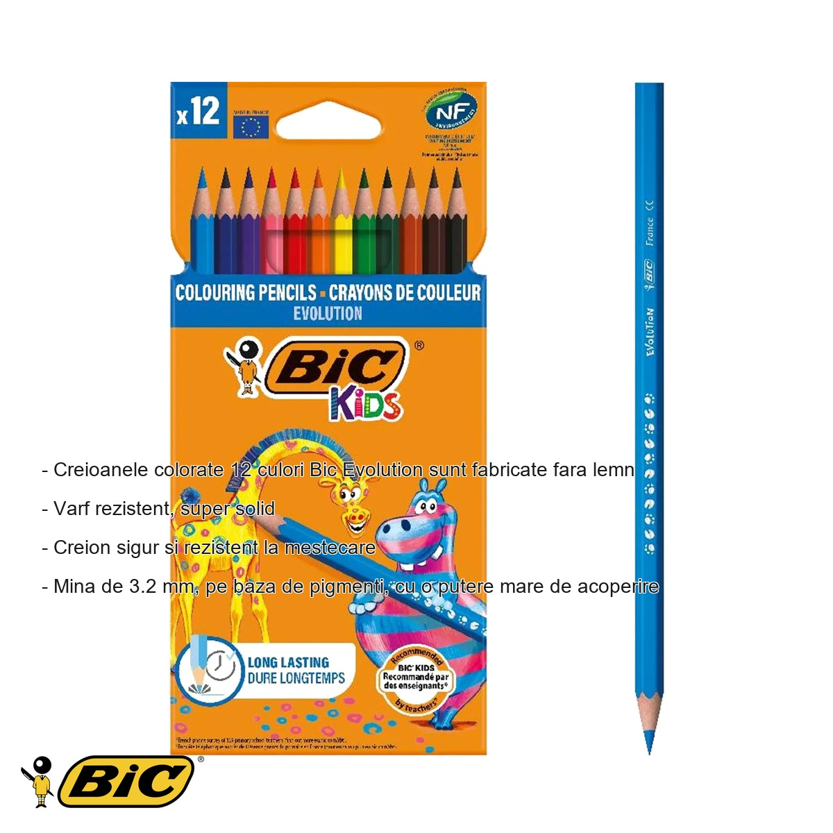Orice copil are nevoie de instrumente de colorat sigure, durabile si usor de folosit. Setul de 12 creioane colorate Bic Evolution raspunde exact acestor nevoi: fabricate fara lemn, din materiale rezistente, aceste creioane ofera o experienta de colorat placuta, sigura si fara surprize neplacute. Fie ca vorbim de teme pentru acasa, activitati artistice la scoala sau momente creative in timpul liber, creioanele Bic Evolution sunt partenerul de incredere al celor mici, dar si al parintilor care pun siguranta pe primul loc.