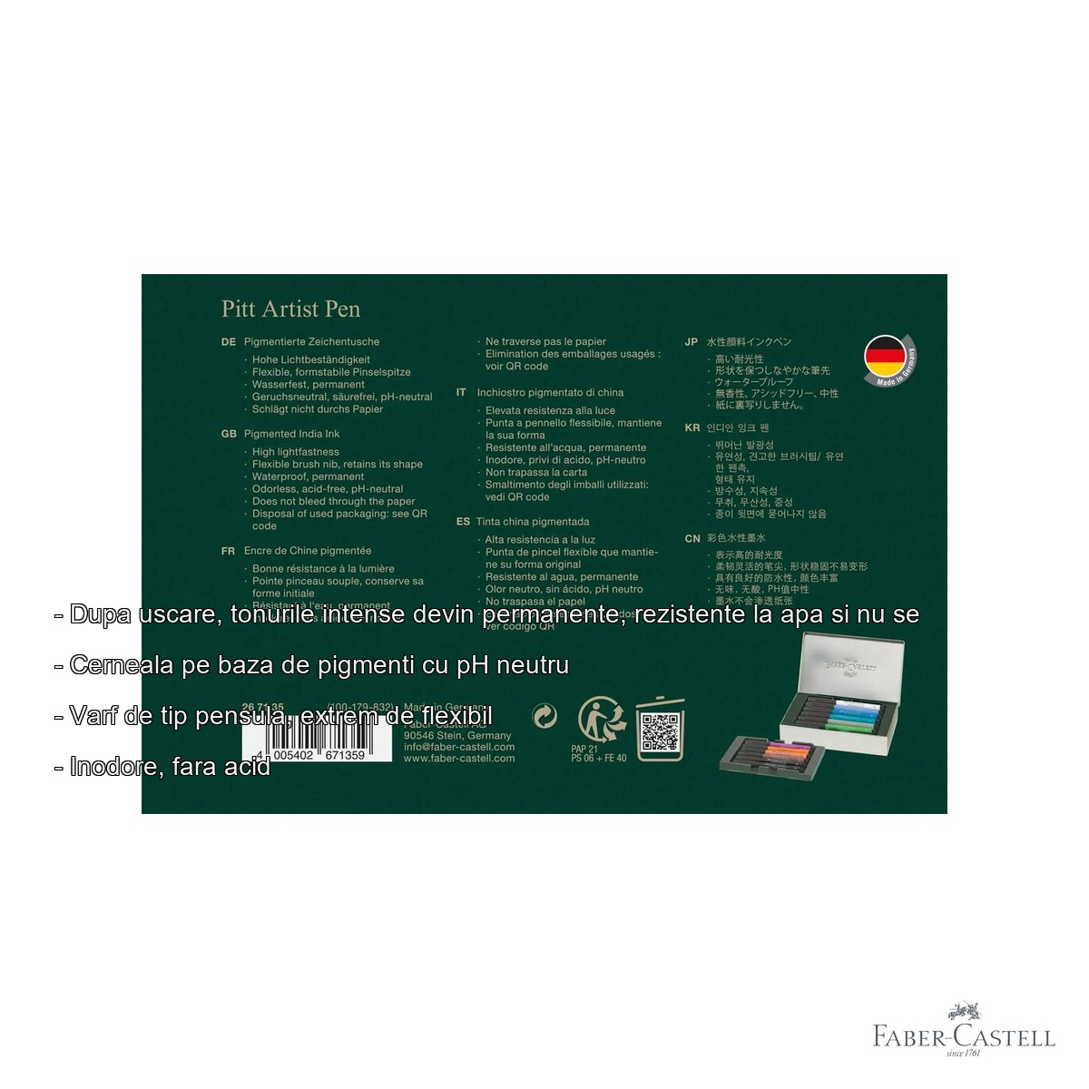Markerele Pitt Artist Pen Faber-Castell se remarca printr-o cerneala pe baza de pigmenti cu pH neutru, ceea ce inseamna ca lucrarile tale vor rezista in timp fara sa se decoloreze sau sa se altereze. Odata uscata, cerneala este complet rezistenta la apa, asa ca poti aplica straturi de acuarela sau alte tehnici umede peste desenele tale fara niciun risc. Varful tip pensula extrem de flexibil iti ofera libertatea de a trasa atat linii foarte fine, cat si trasaturi late si expresive - totul cu acelasi instrument. Faptul ca markerele sunt inodore si fara acid le face confortabile pentru sesiuni lungi de lucru si sigure pentru utilizare zilnica. In plus, cerneala nu penetreaza hartia, protejand astfel lucrarile realizate pe verso sau suporturile mai subtiri.