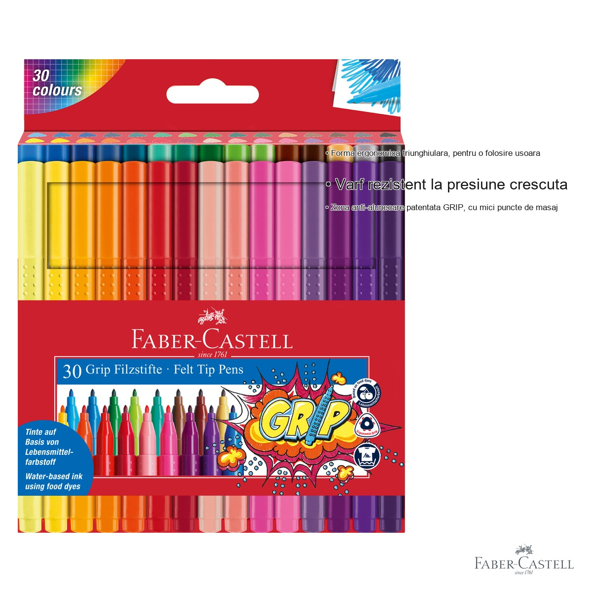 Fie ca vorbim despre activitati artistice la scoala, teme pentru acasa sau momente creative in timpul liber, un set de carioci de calitate face diferenta intre o experienta placuta si una frustranta. Setul de 30 carioci Faber-Castell Grip a fost conceput special pentru a oferi copiilor confort maxim in timpul utilizarii, culori expresive si o cerneala sigura, pe baza de apa. Cu o forma triunghiulara ergonomica si zona anti-alunecare patentata GRIP, aceste carioci sunt perfecte pentru orice elev care doreste sa deseneze, sa coloreze sau sa ilustreze cu precizie si usurinta.