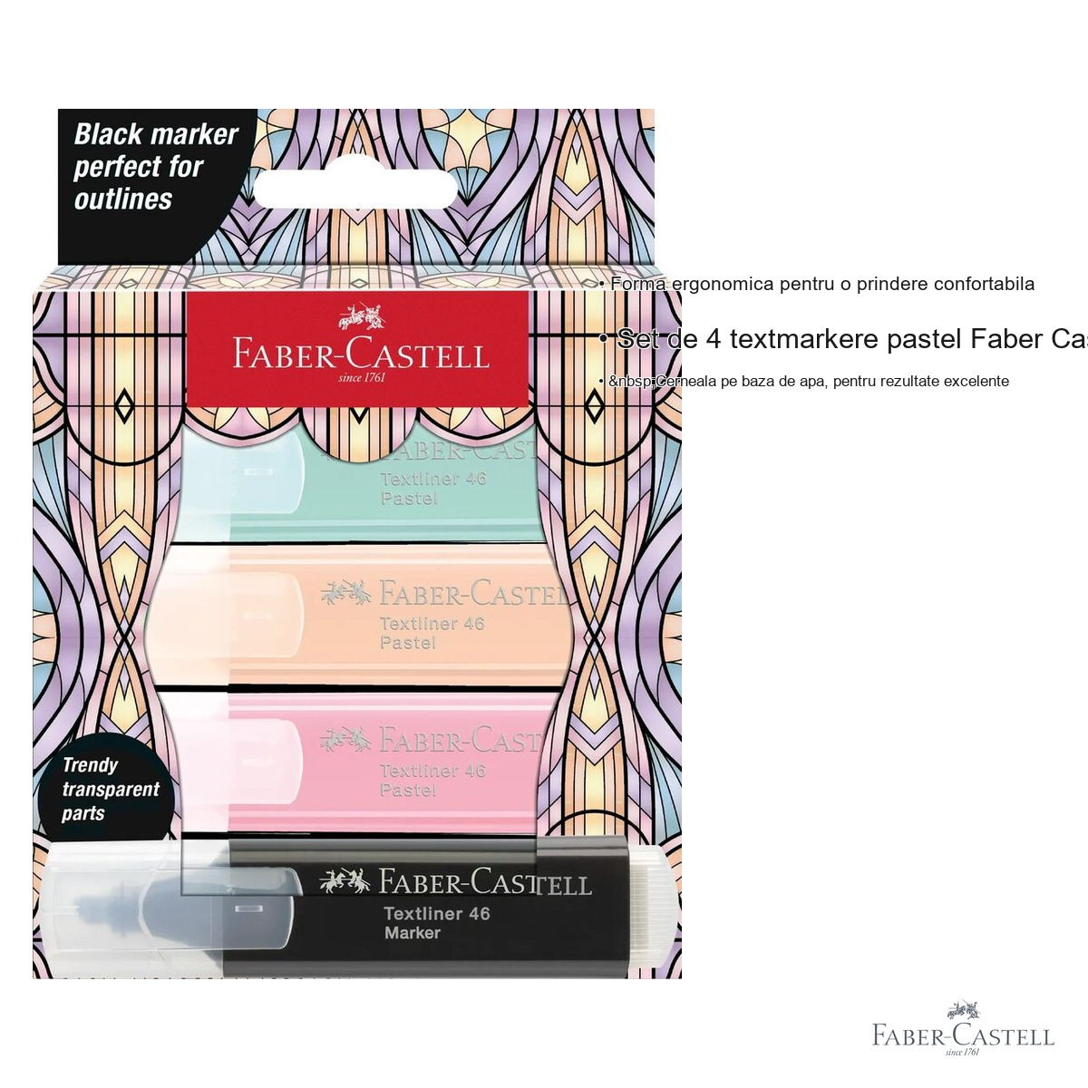 In lumea biroului modern, a scolii sau a studiului acasa, un set de textmarkere de calitate face diferenta intre notite clare, bine organizate, si informatii greu de regasit. Setul de 4 textmarkere pastel Faber-Castell in editie speciala Glassy vine sa raspunda nevoii de precizie, confort si estetica in procesul de subliniere si evidentiere a textelor. Cu nuante pastel delicate si o constructie atent gandita, aceste markere sunt instrumentul ideal pentru studenti, profesionisti si toti cei care vor sa-si organizeze informatiile cu stil si eficienta.