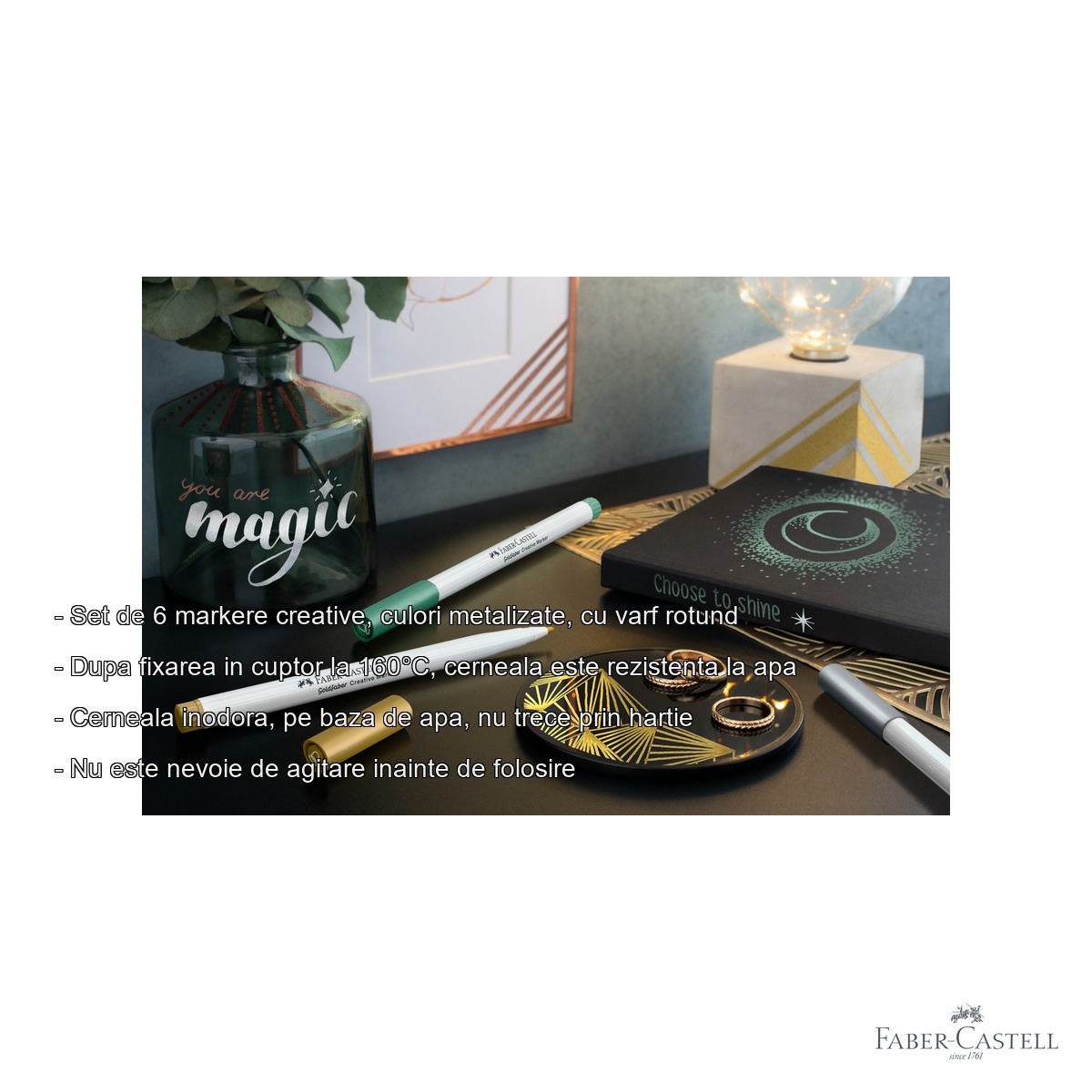 Creativitatea nu ar trebui sa fie limitata de suprafata pe care lucrezi. Daca esti pasionat de arte creative, decoratiuni handmade, scrapbooking, caligrafia sau personalizarea obiectelor, setul de 6 markere creative Faber-Castell Goldfaber cu culori metalizate este alegerea ideala. Aceste markere ofera o cerneala cu efect metalic stralucitor, potrivita pentru o gama larga de suprafete si proiecte creative, fie ca esti artist profesionist, hobbyist sau pur si simplu iti place sa personalizezi obiectele din jurul tau.