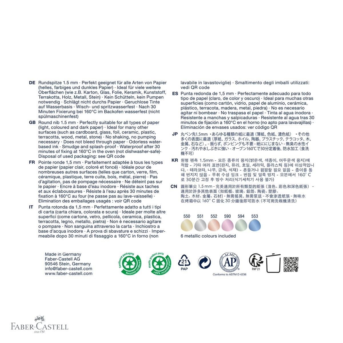 Markerele creative Faber-Castell Goldfaber cu culori metalizate vin cu o serie de avantaje care le fac superioare multor alternative de pe piata. In primul rand, cerneala pe baza de apa este complet inodora, ceea ce le face sigure si placute la utilizare chiar si in spatii inchise sau in ateliere impartite cu copiii. Spre deosebire de multi markere permanente obisnuiti, aceste markere nu emit mirosuri puternice sau substante iritante.