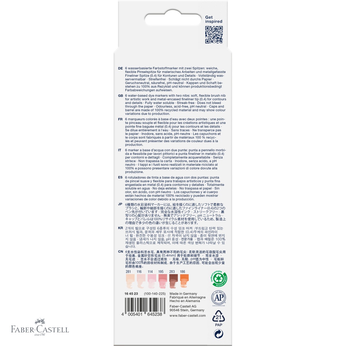 Faptul ca sunt complet solubile in apa deschide o paleta larga de tehnici artistice: culorile pot fi amestecate direct pe hartie, estompate cu o pensula umeda sau diluate pentru efecte translucide similare acuarelei. Formularea inodora si pH-ul neutru le fac potrivite si pentru utilizare in spatii inchise, inclusiv de catre copii mai mari sau studenti. In plus, capacul si corpul fabricate 100% din material reciclat reflecta angajamentul Faber-Castell fata de sustenabilitate.