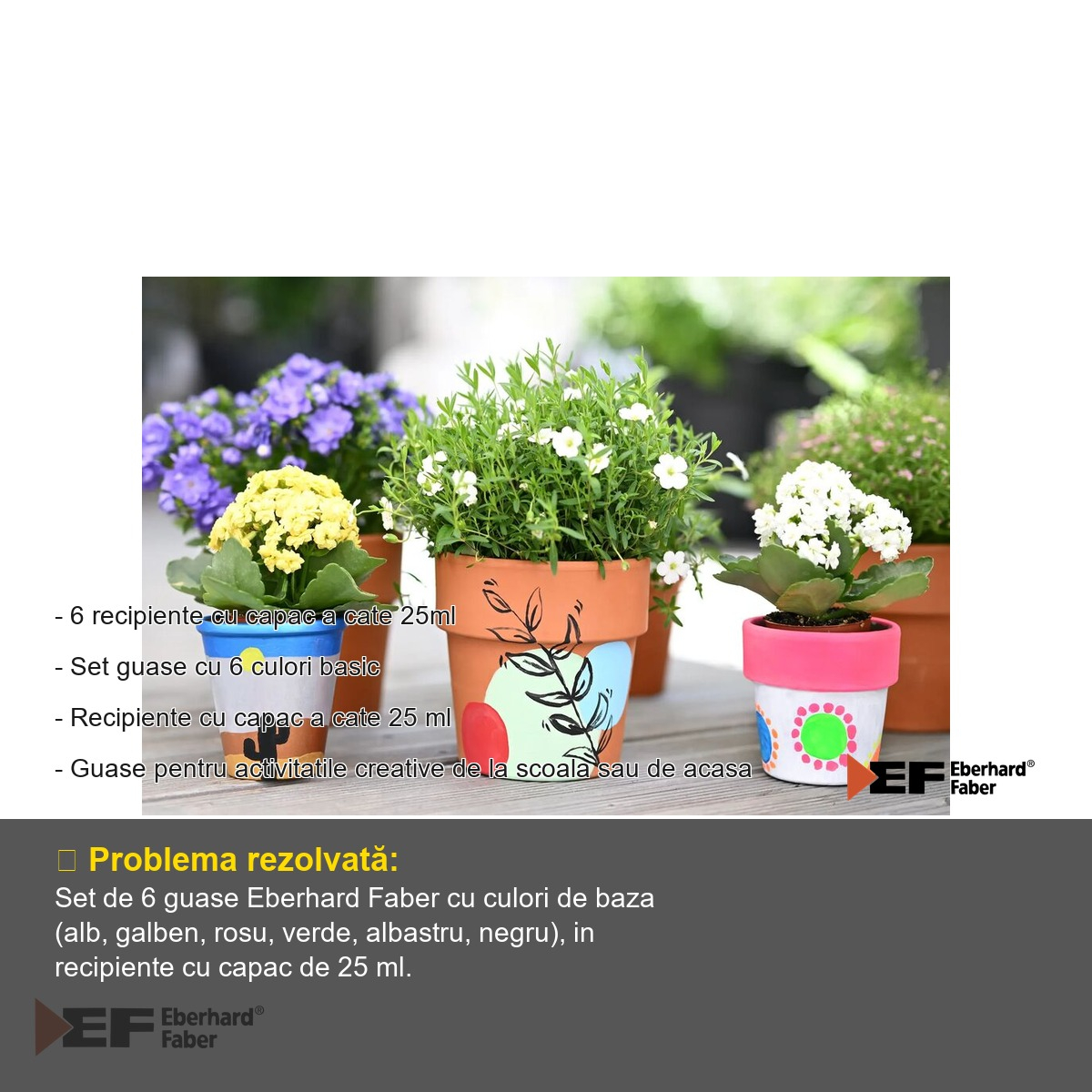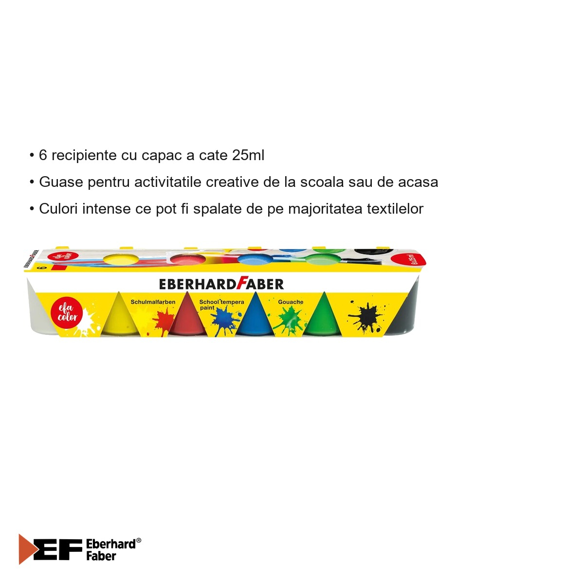 Setul de guase Eberhard Faber Standard ofera o serie de avantaje clare fata de alte produse similare de pe piata. In primul rand, culorile intense asigura rezultate vizuale remarcabile chiar si in cazul unui strat subtire de vopsea, ceea ce inseamna ca un singur recipient va dura mai mult timp. Recipientele individuale cu capac etans previn uscarea guasei si permit depozitarea in siguranta intre sesiunile de lucru, fara riscul de a murdari ghiozdanul sau trusa. Proprietatea de spalabilitate de pe majoritatea textilelor este extrem de importanta pentru parinti, deoarece accidentele sunt inevitabile atunci cand copiii picteaza. Aceasta caracteristica reduce semnificativ stresul asociat cu activitatile artistice si permite copiilor sa se exprime liber. Paleta de 6 culori de baza (alb, galben, rosu, verde, albastru, negru) acopera necesarul pentru orice activitate scolara standard si ofera totodata posibilitatea de a experimenta amestecarea culorilor pentru a obtine nuante noi. Brandul Eberhard Faber garanteaza o formulare constanta si sigura a produsului, adaptata utilizarii de catre copii.
