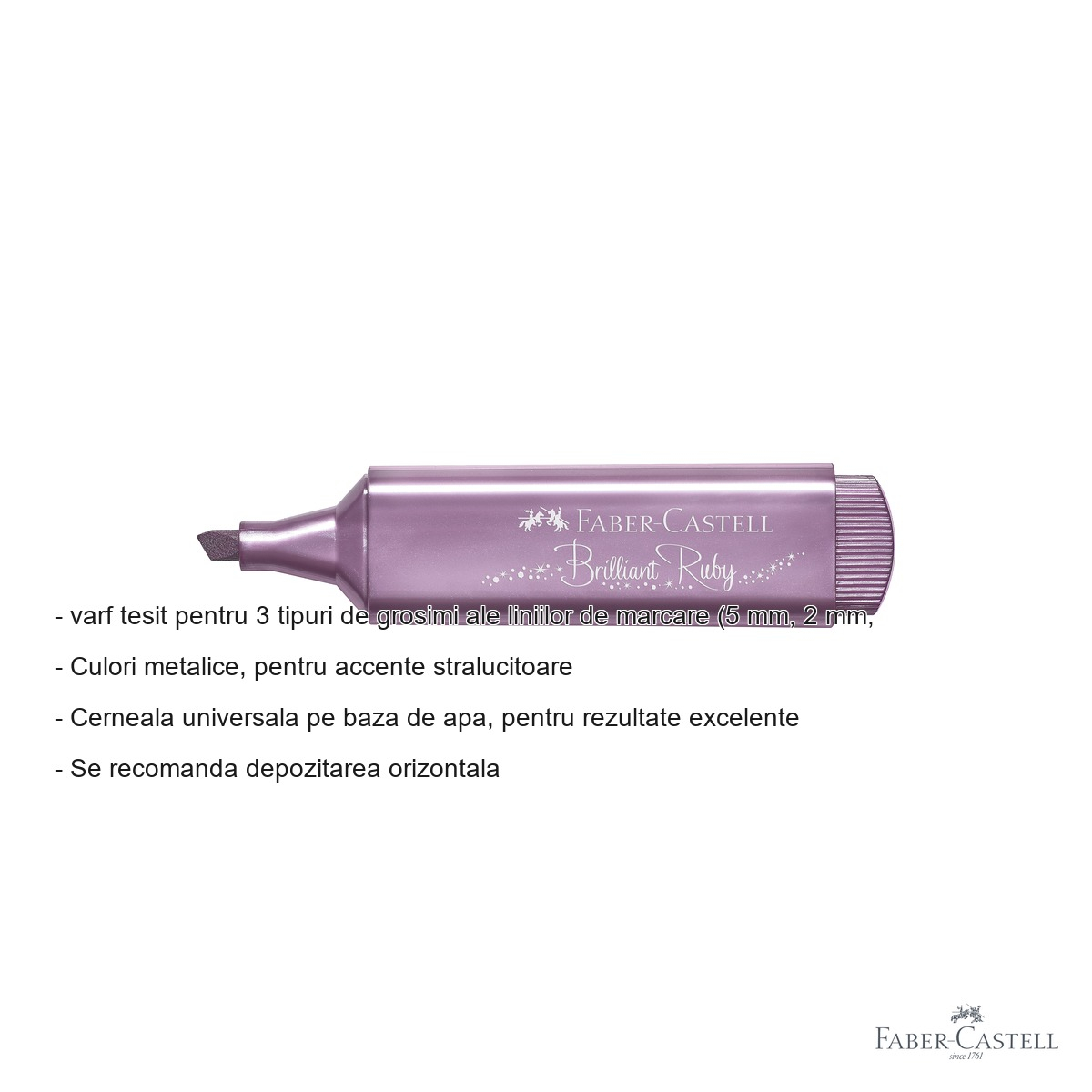 Daca iti doresti sa adaugi un plus de stralucire proiectelor tale creative sau documentelor importante, Textmarkerul metalic rubiniu Faber-Castell 1546 este alegerea ideala. Cu o culoare rubinie intensa si finish metalic, acest marker iese in evidenta fata de textmarkerele clasice, oferind accente vizuale deosebite pe orice suprafata. Fie ca esti student, designer, profesor sau pasionat de crafting, acest instrument de scris combina functionalitatea unui textmarker profesional cu estetica unei culori metalice premium.