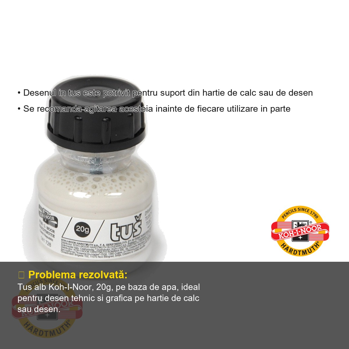 Atunci cand lucrezi la proiecte de desen tehnic, ilustratie sau grafica artistica, alegerea unui tus de calitate face diferenta dintre un rezultat mediocru si unul profesional. Tusul alb Koh-I-Noor de 20g este solutia ideala pentru artistii, studentii la arte sau tehnicieni care au nevoie de un pigment consistent, cu acoperire buna, pe suporturi specifice precum hartia de calc sau hartia de desen. Brandul Koh-I-Noor este recunoscut la nivel mondial pentru traditia si fiabilitatea produselor sale de papetarie si desen, iar aceasta cerneala indiana nu face exceptie.