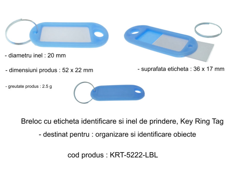 Breloc cu eticheta pentru identificare si inel pentru atasare si prindere la diverse obiecte. Poate fi folosit pentru perioade lungi de timp, este reutilizabil, eticheta poate fi indepartata si inlocuita cu usurinta, permitand utilizarea la diverse articole.