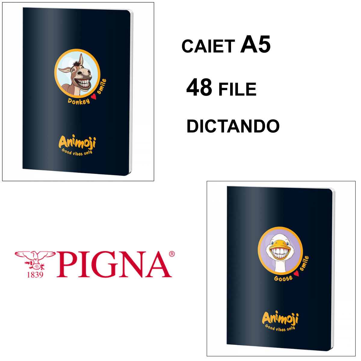 Animoji este o colectie de designuri a brandului Pigna, care include personaje animate, colorate si expresive. Designul exact (tipul personajului) poate varia, dar toate sunt pe fundal negru.