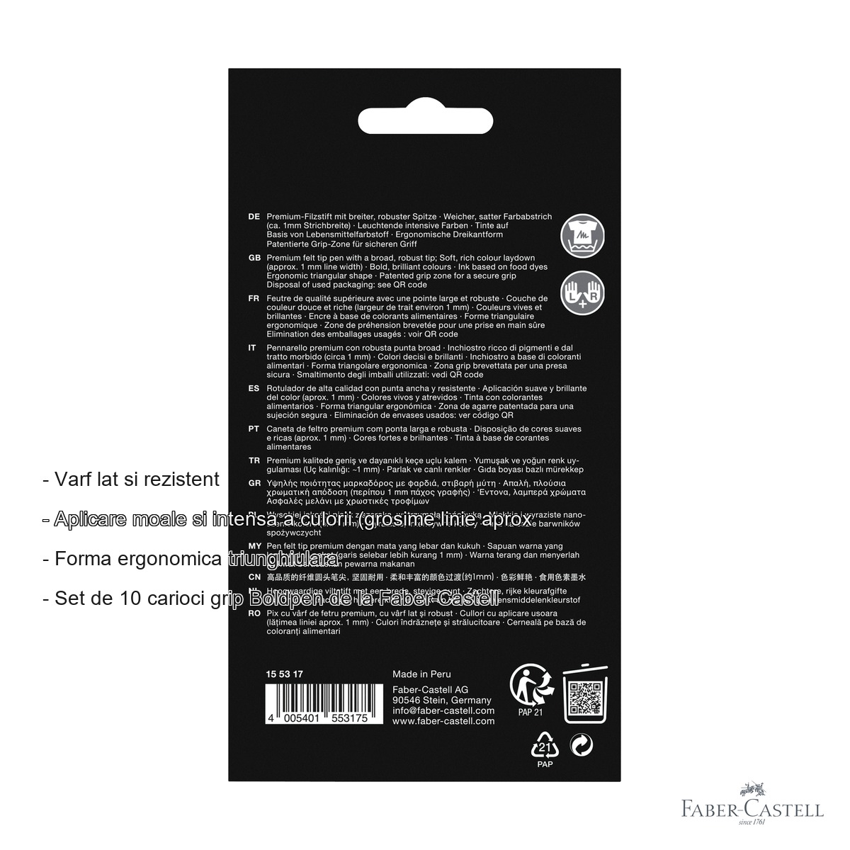 Setul de carioci Faber-Castell Grip Boldpen vine cu o serie de avantaje care il diferentiaza clar de produsele similare de pe piata. In primul rand, cerneala pe baza de coloranti alimentari garanteaza siguranta copilului, eliminand ingrijorarile legate de substante toxice. In plus, datorita proprietatilor lavabile ale cernelii, petele lasate accidental pe haine sau pe alte suprafete textile pot fi indepartate cu usurinta la spalare.