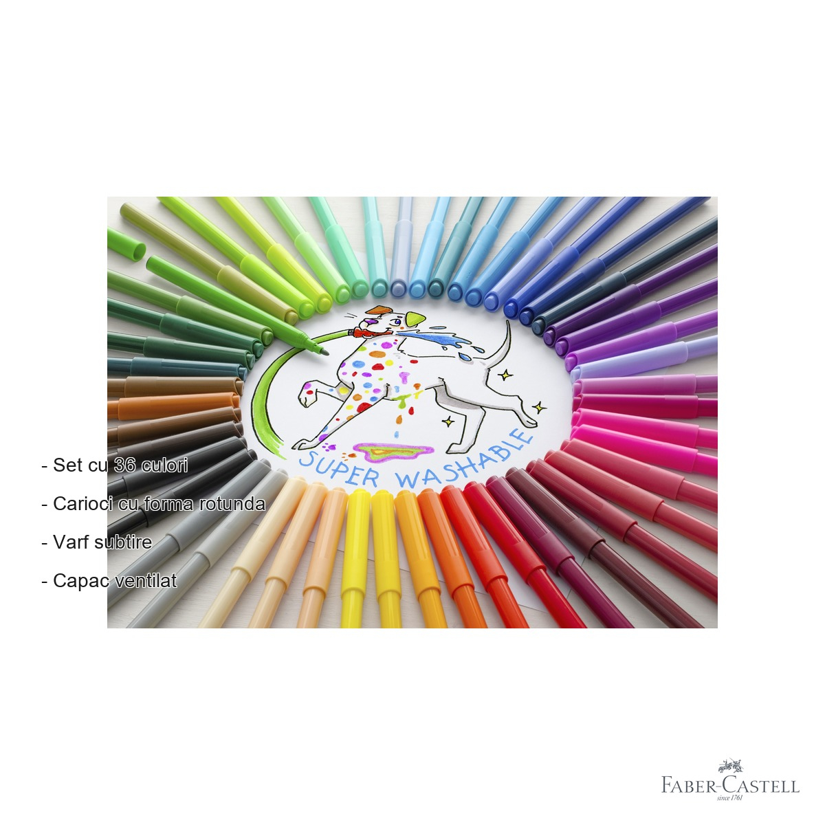 Setul de carioci Faber-Castell cu 36 de culori aduce o serie de avantaje clare fata de seturile obisnuite. In primul rand, cerneala pe baza de apa si substante naturale este prietenoasa cu pielea sensibila a copiilor, reducand riscul de iritare in cazul contactului accidental. Un alt beneficiu major este faptul ca petele lasate pe tesaturi pot fi indepartate prin spalare pe majoritatea materialelor textile, ceea ce reprezinta un mare avantaj pentru parinti. Capacul ventilat al fiecarei carioci este un element de siguranta gandit special pentru copii, permitand circulatia aerului in cazul unui accident. Varful subtire permite trasaturi precise, ideale atat pentru colorat in spatii mici, cat si pentru scriere sau conturare. Forma rotunda a corpului asigura o prindere naturala si confortabila, reducand oboseala mainii in timpul activitatilor prelungite. Gama de 36 de culori este suficient de variata pentru a acoperi aproape orice nevoie creativa, de la nuante de baza la tonuri mai speciale, facand din acest set o alegere completa si eficienta din punct de vedere al pretului.