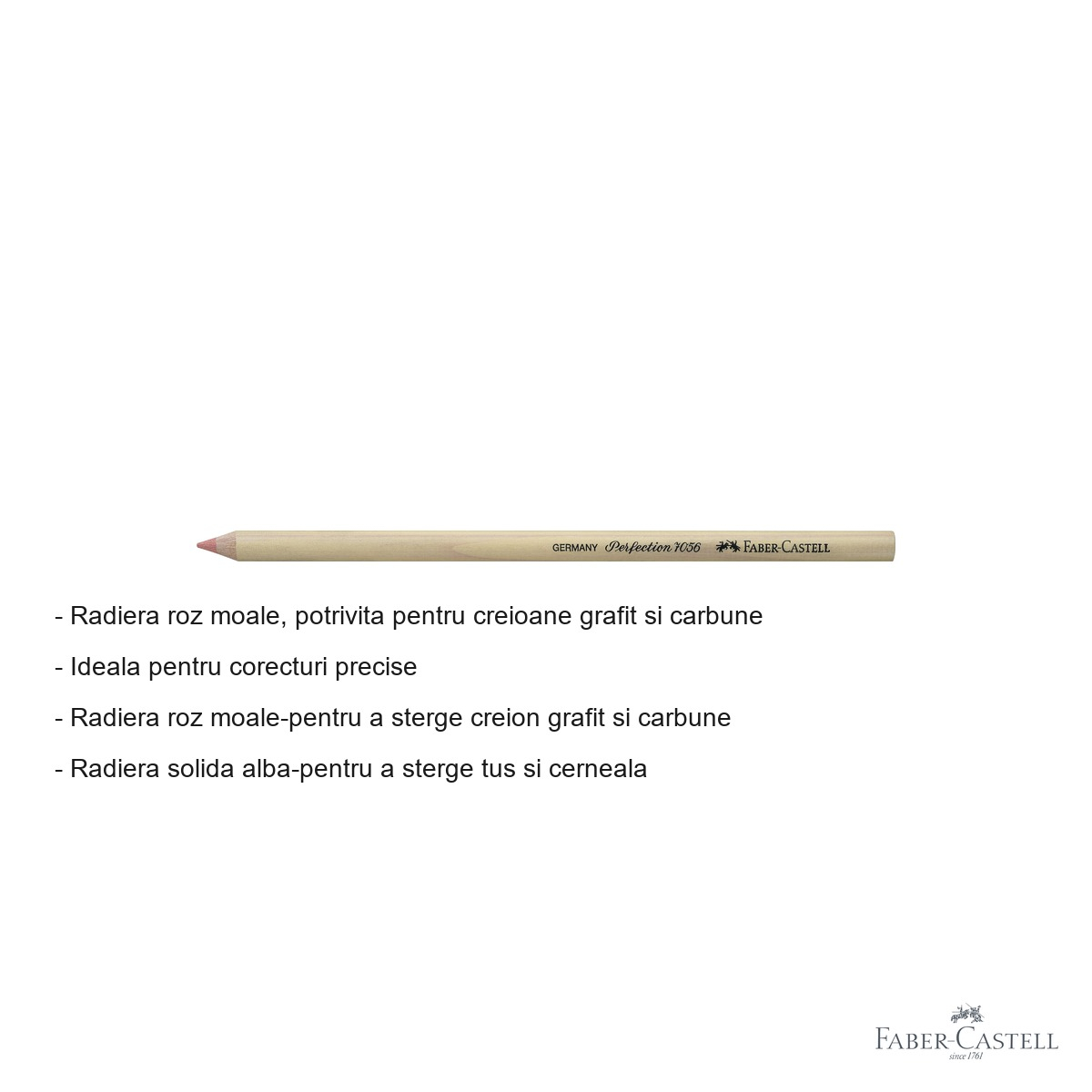 Radiera Faber-Castell Perfection 7056 combina doua tipuri de radiere intr-un singur produs: roz moale pentru grafit si carbune, alba solida pentru tus si cerneala. Ideala pentru corectii precise. Nu contine latex.
