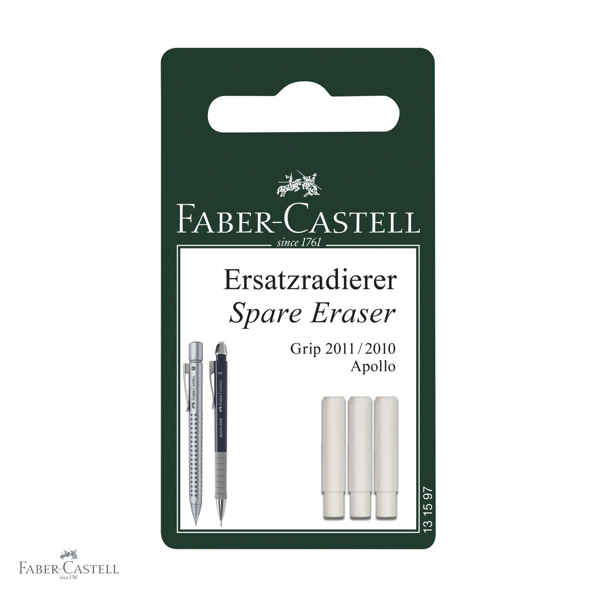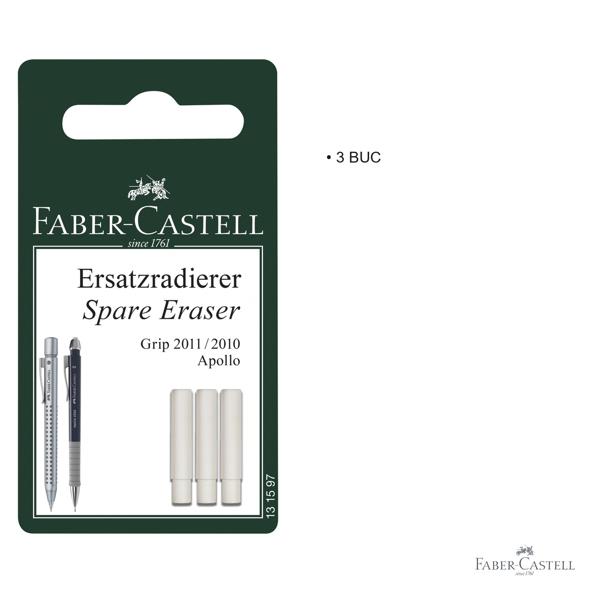 Pentru a inlocui rezerva de radiera a creionului mecanic Faber-Castell Grip 2011, Grip 2010 sau Apollo, scoate cu grija radiera uzata din locasul ei de la capatul creionului si introduci una noua din acest set. Asigura-te ca rezerva este bine fixata inainte de utilizare. Se recomanda pastrarea rezervelor neutilizate in ambalajul original pentru a le proteja de factori externi (caldura excesiva, umiditate, praf). Acest produs este destinat exclusiv modelelor de creioane mecanice mentionate si nu garanteaza compatibilitatea cu alte marci sau modele de creioane mecanice.