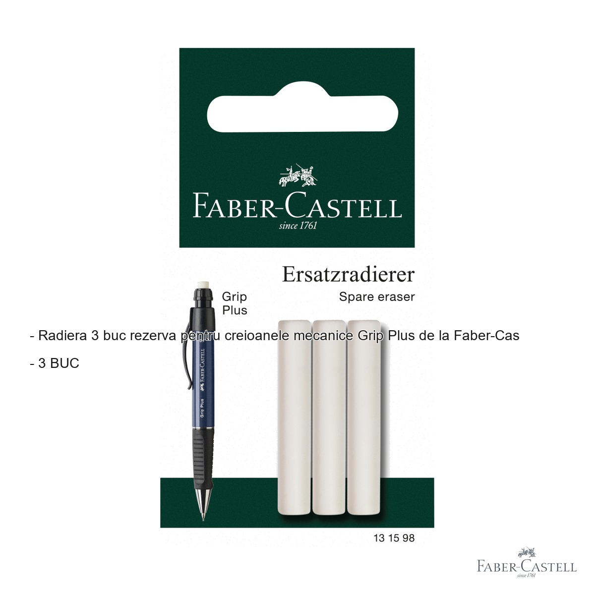 Pentru a obtine cele mai bune rezultate, este recomandat sa inlocuiesti rezerva radiera imediat ce observi ca performanta de stergere scade sau ca radiera a ajuns la limita de utilizare. Inainte de montare, asigura-te ca portiunea ramasa din radiera veche a fost complet indepartata din locasul creionului. Monteaza rezerva noua ferm, urmand instructiunile incluse cu creionul mecanic Grip Plus. Pastreaza rezervele nefolosite in ambalajul original tip blister, la loc uscat si ferit de caldura excesiva, pentru a le mentine in conditii optime. Acest set este recomandat exclusiv pentru creioanele mecanice Faber-Castell Grip Plus, asigurand compatibilitate si performanta maxima.