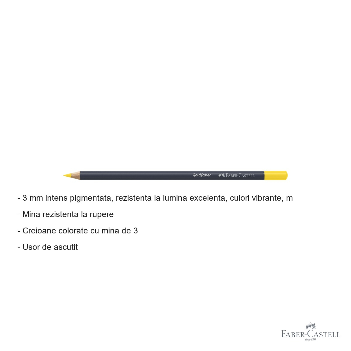 Creion colorat Faber-Castell Goldfaber cu mina de 3.3 mm, intens pigmentata si rezistenta la lumina. Culoare vibranta, moale si usor de ascutit, ideal pentru desen artistic si ilustratie.
