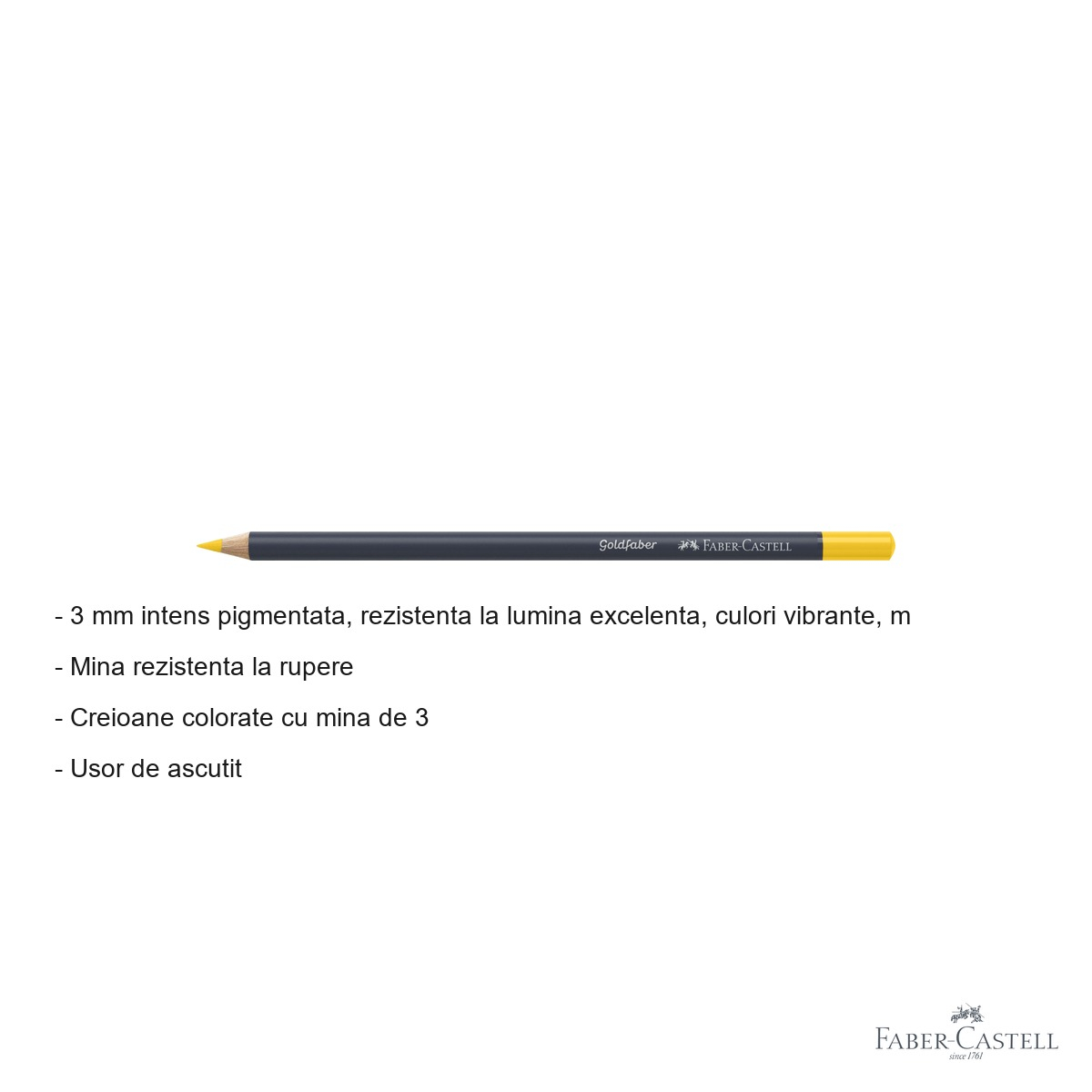 Tehnologia noua si inovativa folosita de Faber-Castell in productia gamei Goldfaber asigura o consistenta ridicata a calitatii de la creion la creion, astfel incat sa poti combina mai multe bucati din aceeasi gama cu rezultate previzibile si profesionale.