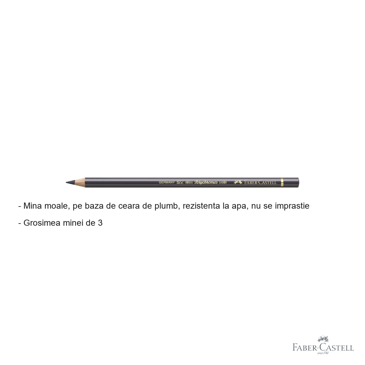 Gama Polychromos de la Faber-Castell se distinge prin mai multe avantaje clare fata de creioanele colorate standard disponibile pe piata. In primul rand, stabilitatea la lumina a pigmentilor inseamna ca lucrarile tale isi vor pastra aspectul original pe termen lung, fara sa se decoloreze sau sa paleasca. Acesta este un aspect esential pentru artistii care expun sau arhiveaza lucrarile lor. In al doilea rand, mina moale pe baza de ceara de plumb cu diametru de 3.8 mm permite aplicarea uniforma a culorii, o stratificare excelenta si o blendare fluida cu alte creioane din aceeasi gama. In al treilea rand, rezistenta la apa a minei face posibila utilizarea creionului in tehnici mixte, inclusiv combinatia cu acuarele sau tuse lichide, fara riscul de difuzare sau murdarire a lucrarii. Nuanta de gri cald este o culoare versatila, esentiala in orice paleta a unui artist, folosita frecvent pentru umbre calde, texturi de piele, fundaluri discrete si tranzitii tonale fine.