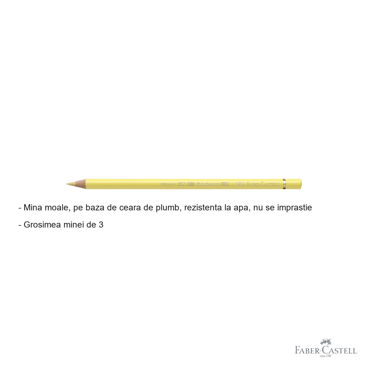 Gama Polychromos de la Faber-Castell este recunoscuta la nivel international pentru calitatea sa superioara. Mina cu diametru de 3.8 mm asigura un traseu consistent, permitand atat detalii fine, cat si acoperirea unor suprafete mai mari. Baza de ceara de plumb a minei garanteaza o aplicare lina si uniforma pe hartie, carton sau alte suprafete de desen, fara a lasa urme nedorite sau a deteriora fibra suportului.