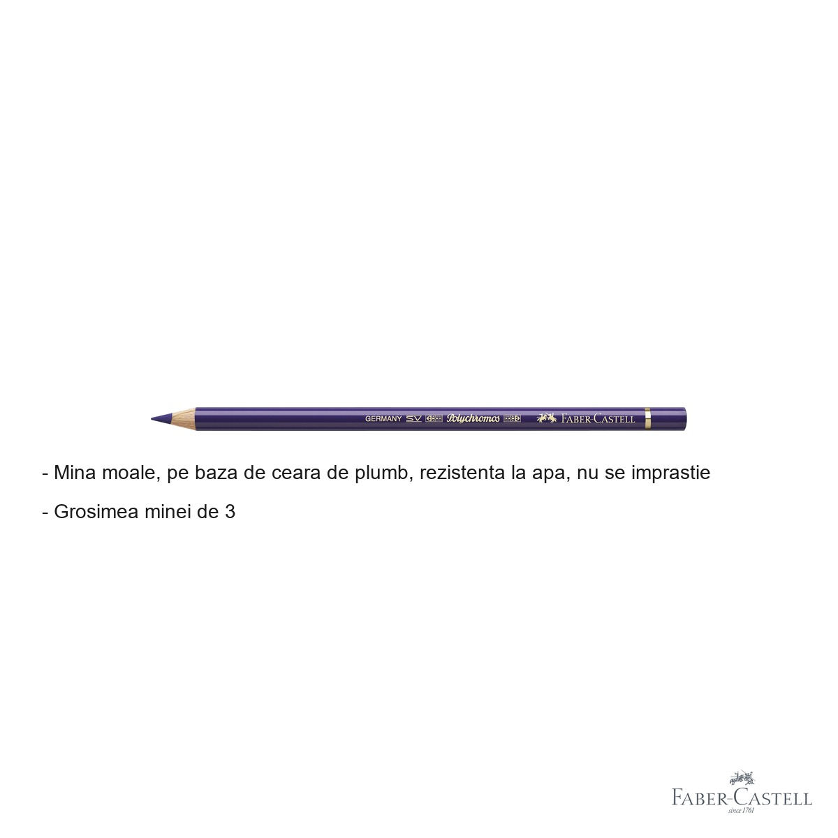Gama Polychromos de la Faber-Castell este recunoscuta la nivel mondial pentru standardele sale ridicate de fabricatie si pentru paleta cromatica vasta si fidela. Fiecare creion din aceasta gama este fabricat cu atentie la detalii, iar creionul mov nu face exceptie – culoarea este profunda, uniforma si se depune usor pe suprafata hartiei, fara a necesita o presiune excesiva.