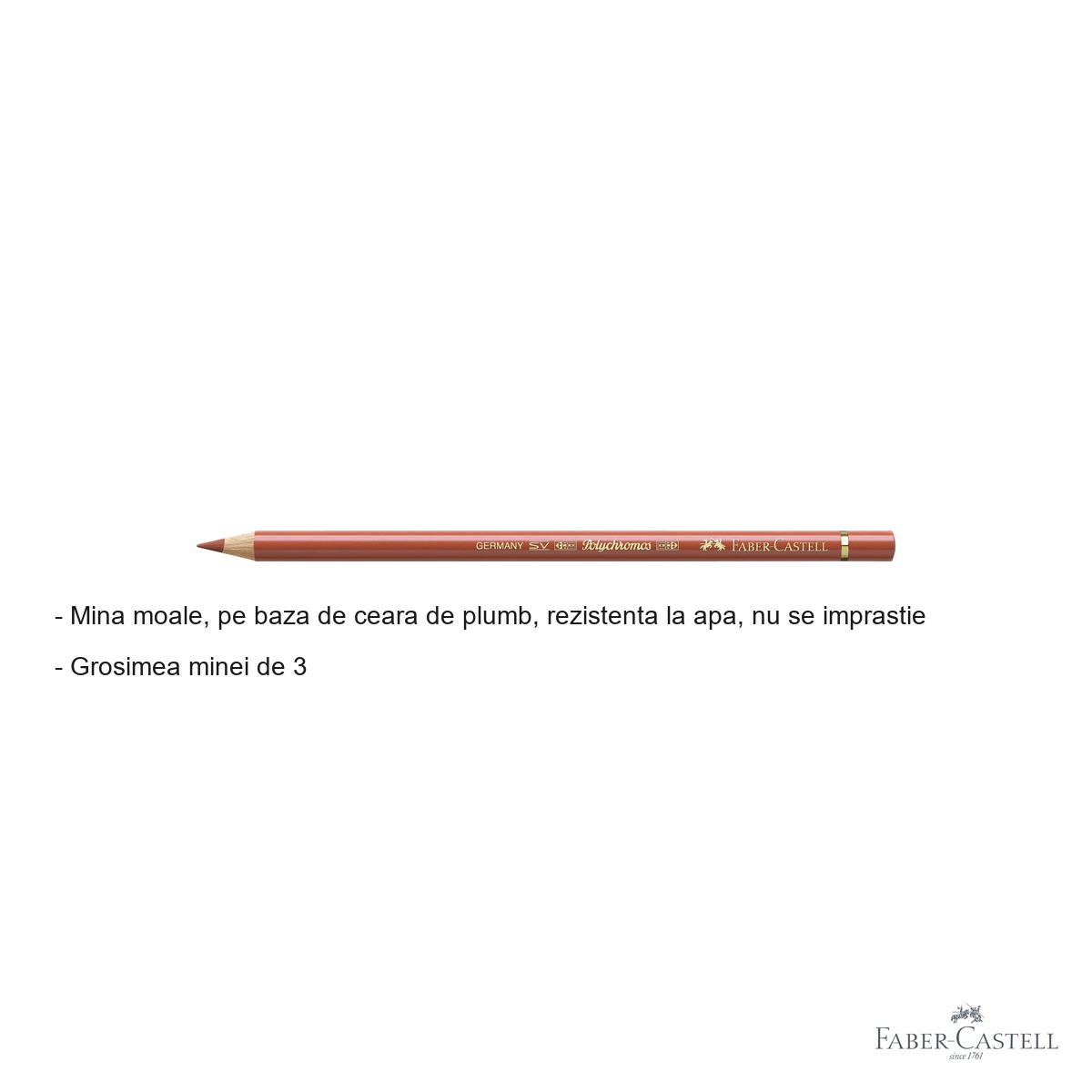 Creionul Faber-Castell Polychromos rosu sangvin ofera o serie de avantaje clare fata de creioanele colorate obisnuite. In primul rand, calitatea deosebita a pigmentilor asigura o culoare intensa, vie si stabila in timp - inclusiv la expunerea la lumina, ceea ce este esential pentru lucrarile destinate expunerii sau pastrarii indelungate. Mina moale pe baza de ceara de plumb permite o aplicare fluida pe suprafata hartiei, facilitand tranzitii line de culoare, hasuiri delicate si suprapuneri de straturi fara deteriorarea suportului. Rezistenta la apa a minei este un avantaj important atunci cand creatia este finisata cu tehnici mixte, de exemplu combinarea cu acuarela sau markere pe baza de apa. Un alt beneficiu major este faptul ca mina nu se imprastie pe suprafete - desenul ramane curat, precis si usor de controlat, indiferent de presiunea aplicata.