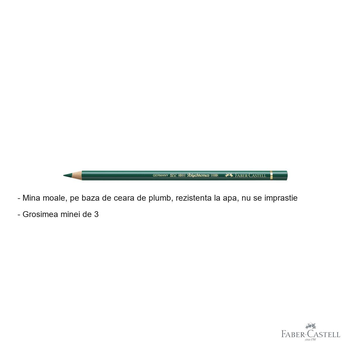 Pentru artistii care nu fac compromisuri in ceea ce priveste calitatea, creionul colorat Faber-Castell Polychromos in nuanta verde reprezinta alegerea ideala. Fie ca esti ilustrator profesionist, student la arte sau pasionat de desen, acest creion iti ofera controlul si precizia necesare pentru a crea lucrari cu detalii fine si culori vibrante. Gama Polychromos este recunoscuta la nivel mondial pentru performanta sa superioara, iar acest creion in nuanta verde este un instrument esential in orice trusou de artista.